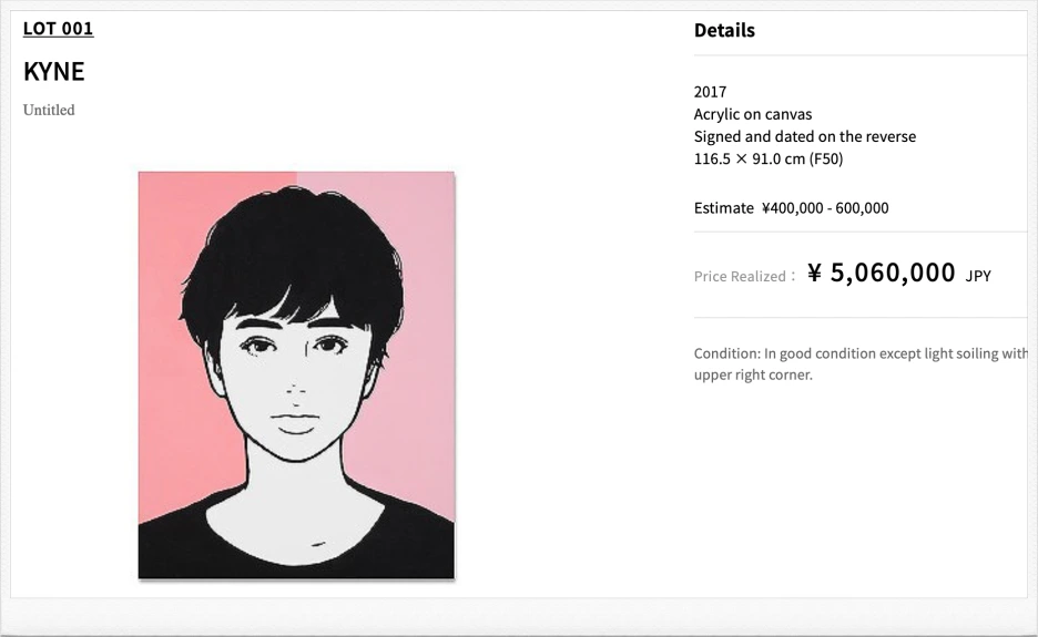 당시 키네라는 루키의 작품 중 한 점이 메구루 야마구치와의 콜라보 작품이었는데 이때 그의 이름을 처음 접했다. 물론 이 작품도 추정가의 1000%를 육박하여 거래가 되어 헉! 했던 기억이 난다.