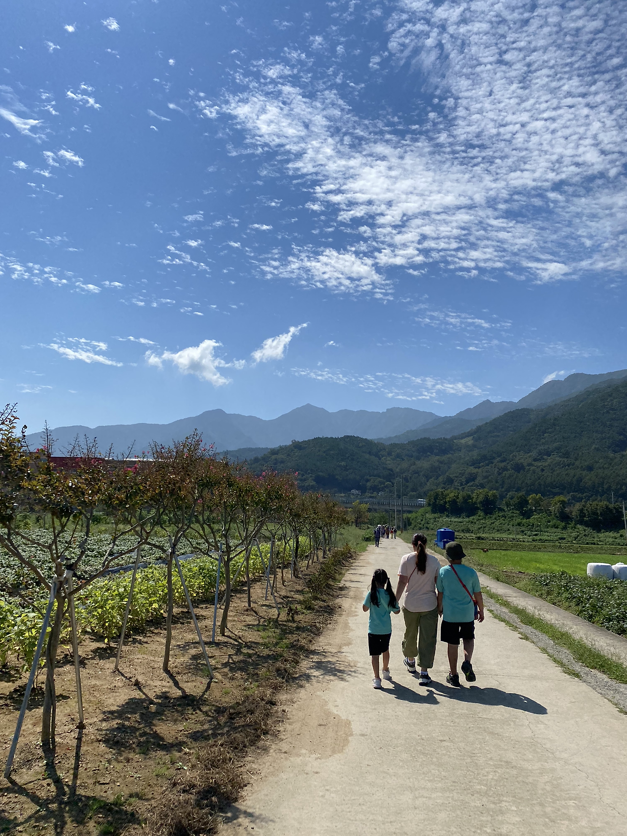 하지만 얼마 지나지 않아 문제는 그게 다가 아니었음을 깨달았다. 어느 순간 강을 끼고 걷던 나무 그늘 가득한 데크 길은 사라지고, 차도와 촌길을 걸으며 맞게 되는 작렬하는 태양빛에 우리는 금세 지쳐갔다. 이 걸음에 이미 익숙한 다른 어른 일행들은 점차 우리 가족과 멀어져만 갔다. 급격한 더위에 아이들은 갈증을 호소하며 힘들어했고, 급기야 내가 둘째를 업어야 하는 지경에 이르렀다.