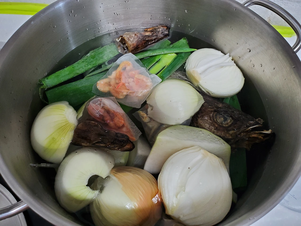 그 대신 양파 3개, 무 반개 넣고 명태 대가리와 디포리를 많이 넣었으니 다행이다 하며 안심한다.