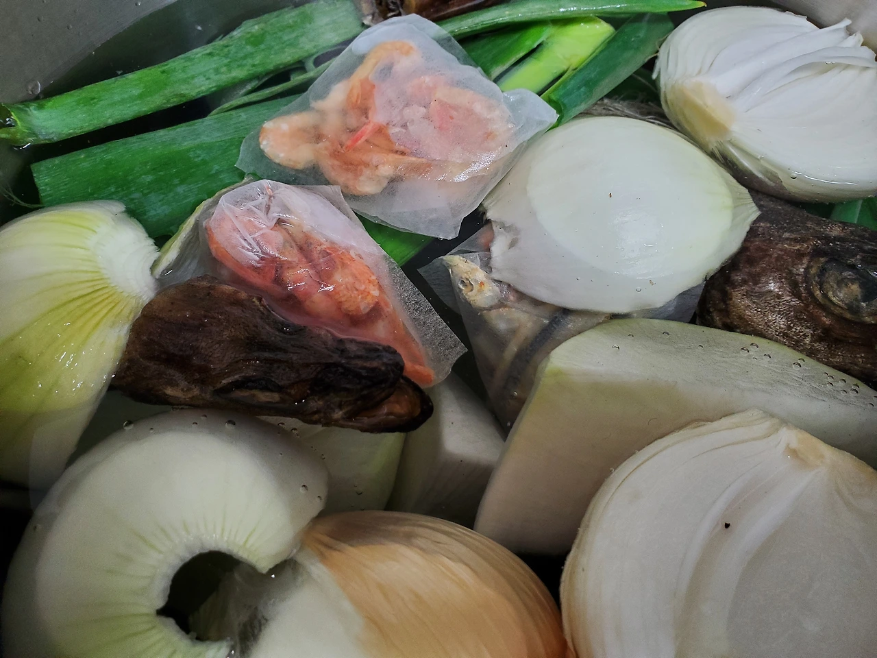 양파, 무, 명태 대가리, 디포리, 다시 멸치, 당근, 호박 등 안 먹는 야채를 넣고 끓이면 된다.