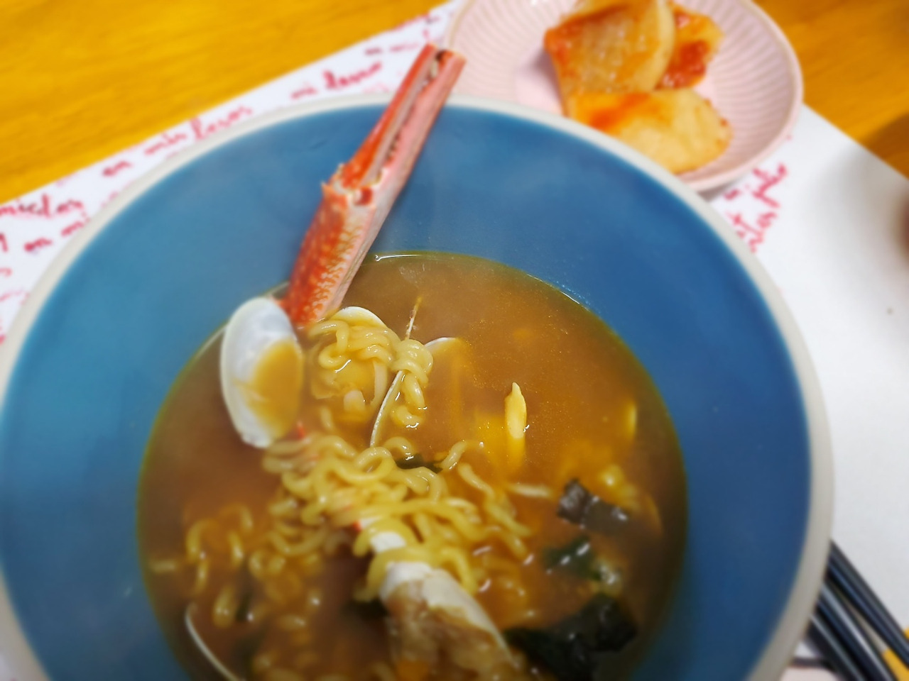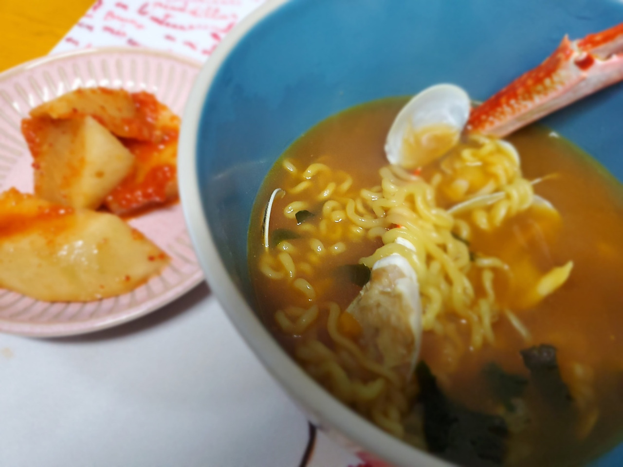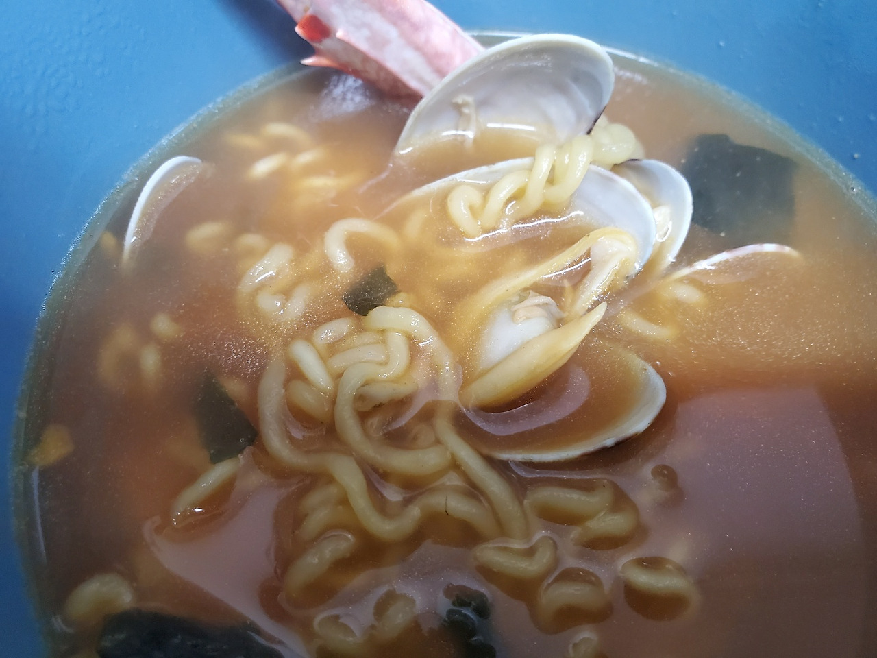 대게와 바지락을 넣고 끓이는 라면,