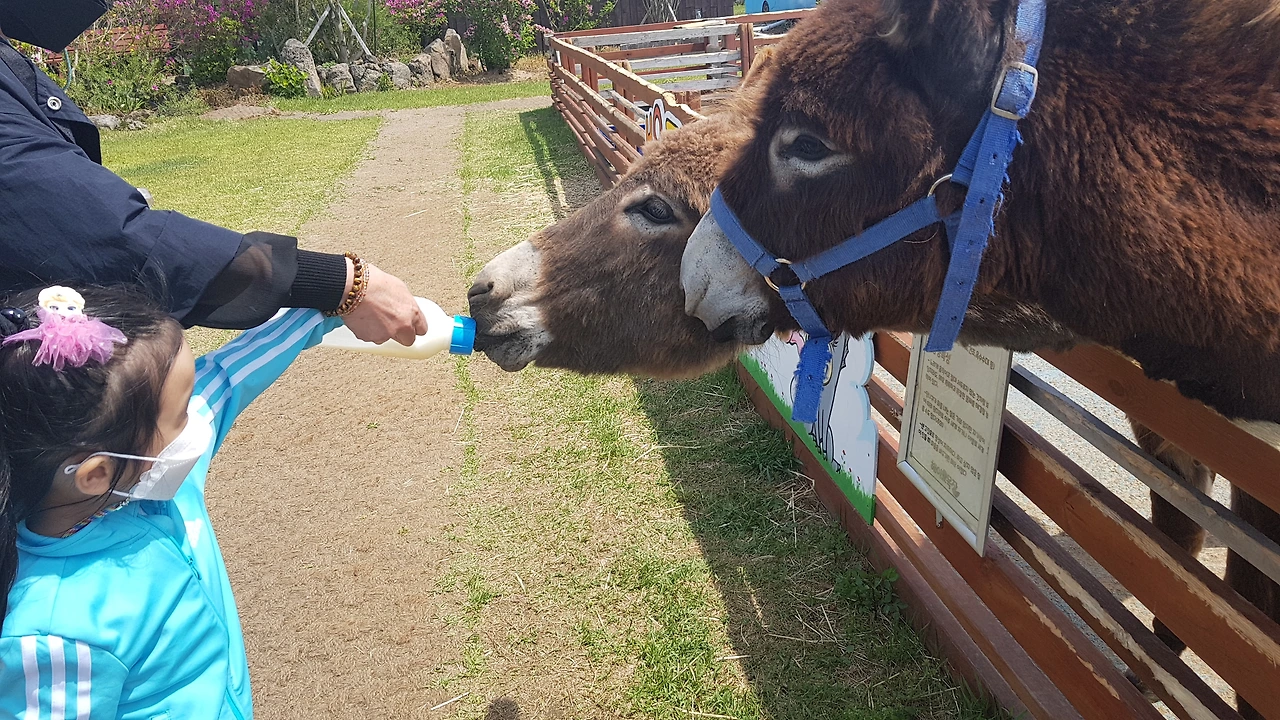 목장원에 주차를 하면 입구부터 유럽에 온 것처럼 느껴지는 인테리어가 마음에 들었다. 아이는 '야호' 신나는 비명을 질렀다. 입장료와 조랑말에게 줄 우유와 양과 다른 동물들에게 줄 먹이를 구입하고 들어서니 아이가 좋아하는 동물들만 있었다.