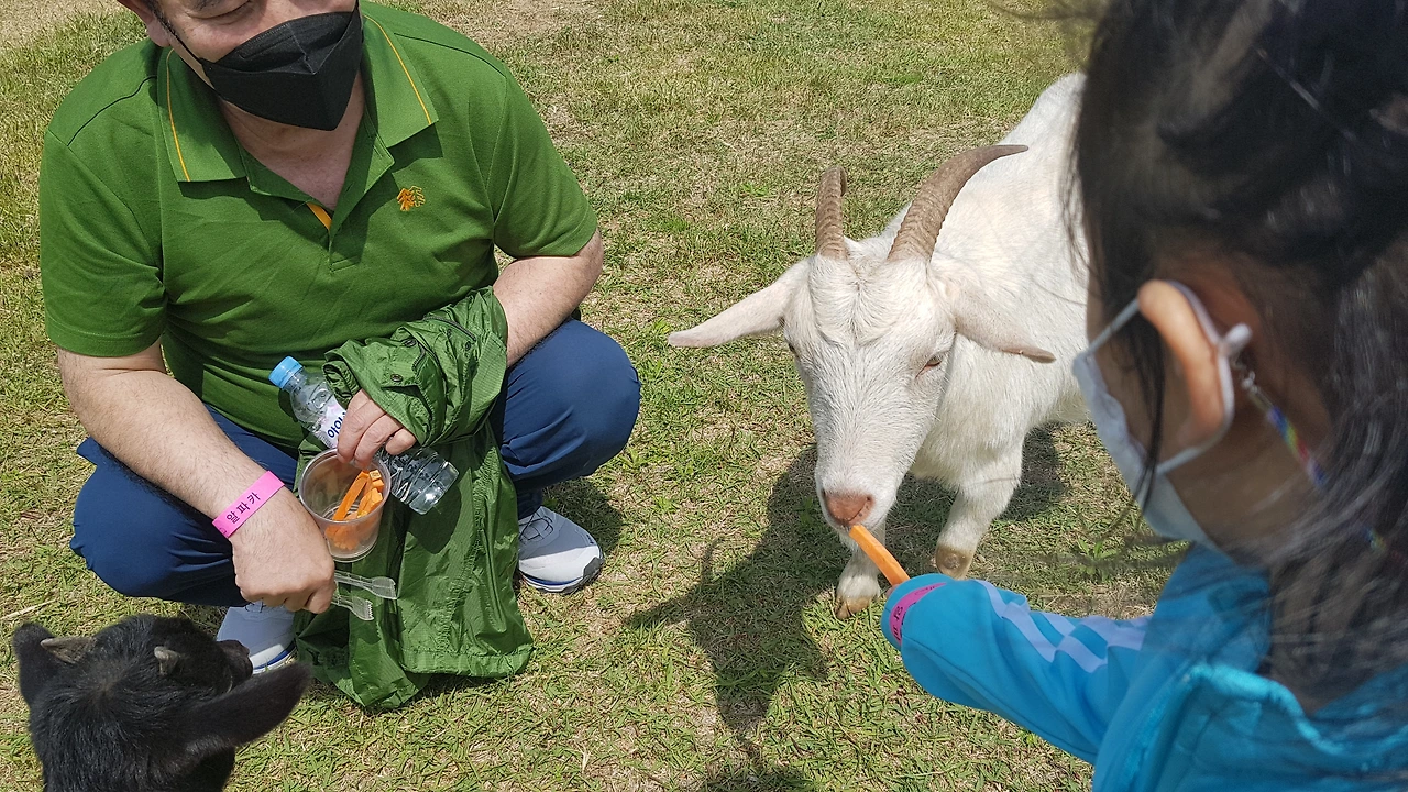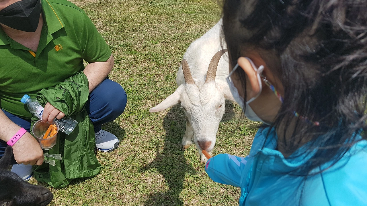 그렇게 머리를 박으며 분유를 더 얻어먹은 강자 말이 싫다고 다른 동물 보러 가자는 아이는 넓은 들판을 뛰어다니는 양과 염소 쪽으로 향했다. 그쪽으로 가다 움직임 조차 없는 말이 안쓰러워 한참을 이야기하며 쳐다보다 말이 좋아하는 당근을 줘도 움직임이 없었다. 은근히 걱정된 친정엄마와 아저씨 그리고 우리 모녀. 말 옆에 누워 있는 새끼 말까지 널브러져 있어 아픈 건 아닌지 염려되었다. 한참을 지켜보다 염소가 있는 곳, 양 새끼가 있는 곳으로 발길을 옮겼다.