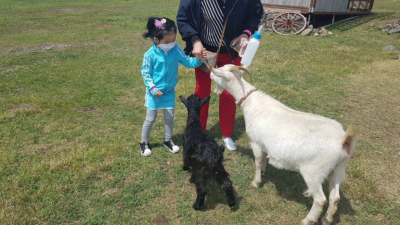 양과 염소는 들판에 풀어놓고 있었다. 새끼들도 많아서 아이는 무서워하면서도 즐거워했다. 이걸로 충분히 만족한 코스라고 생각했다.