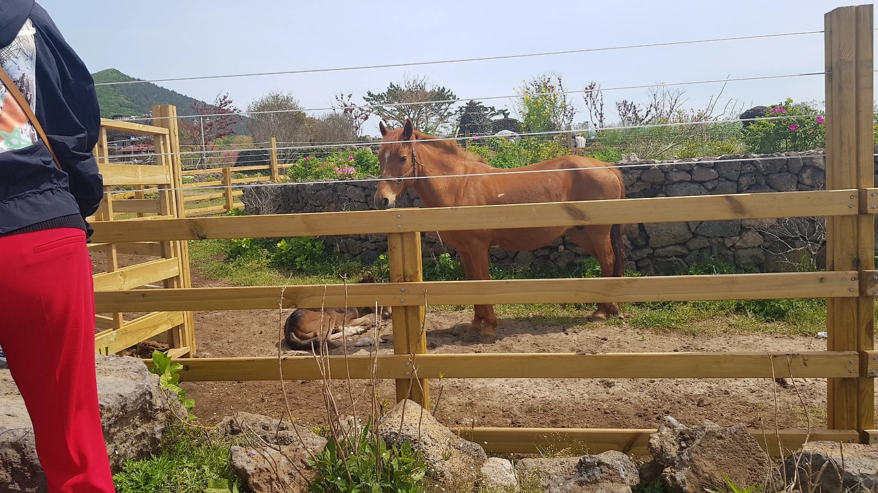 "아.. 저 안에 있는 말 말하는 거죠? 그 말 며칠 전에 새끼를 출산했어요. 아마 새끼가 기운 차릴 동안 움직이지도 않고 먹이도 안 먹을 거예요. 새끼 지킨다고 미동 없이 가만히 서 있는 거예요"
