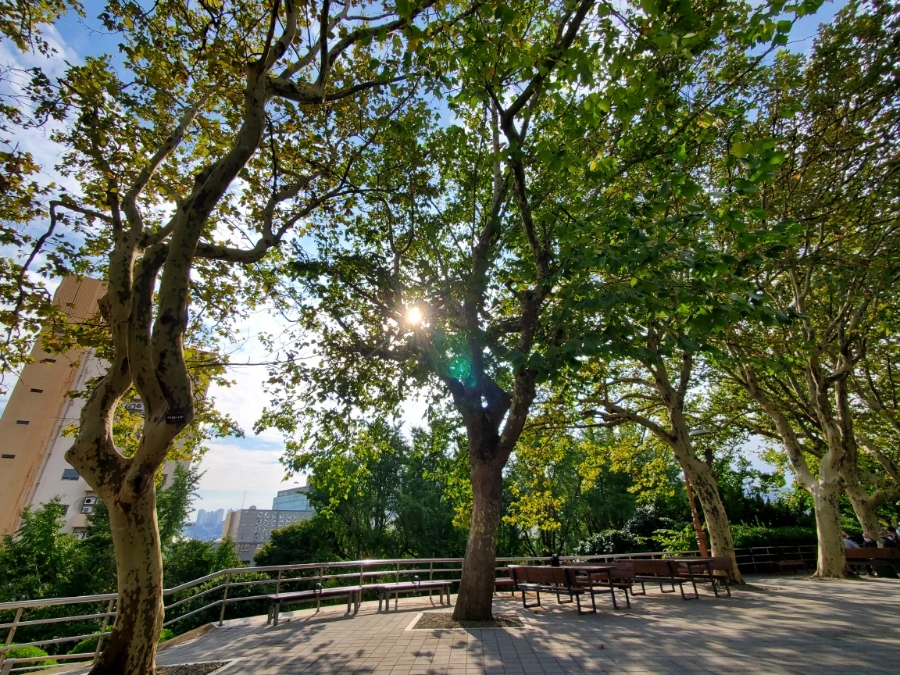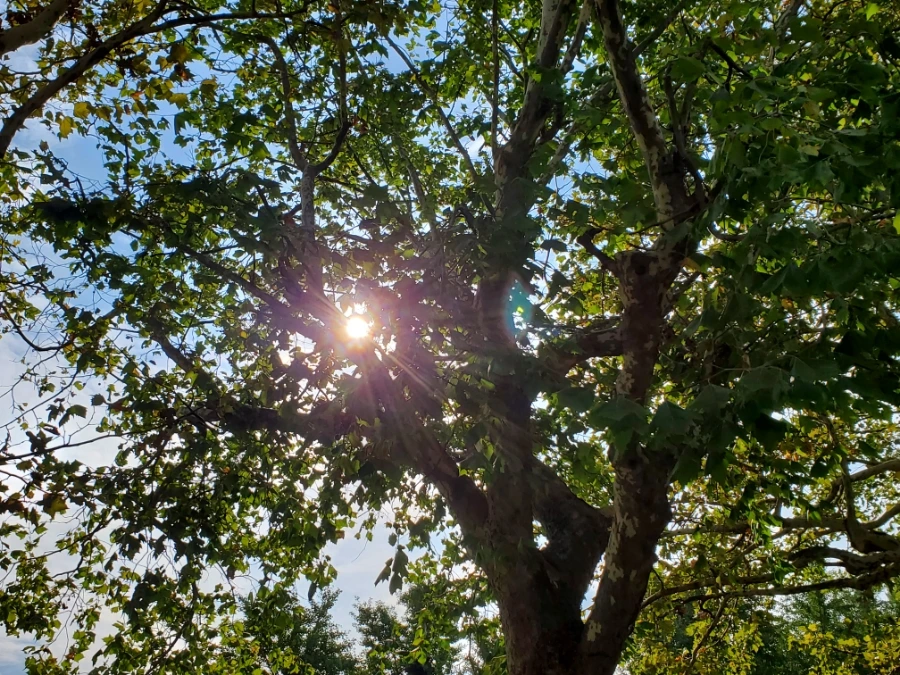 오래된 나무 밑에서 해를 피해 오후 햇살을 바라보고 있다.