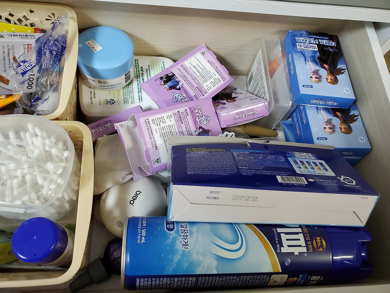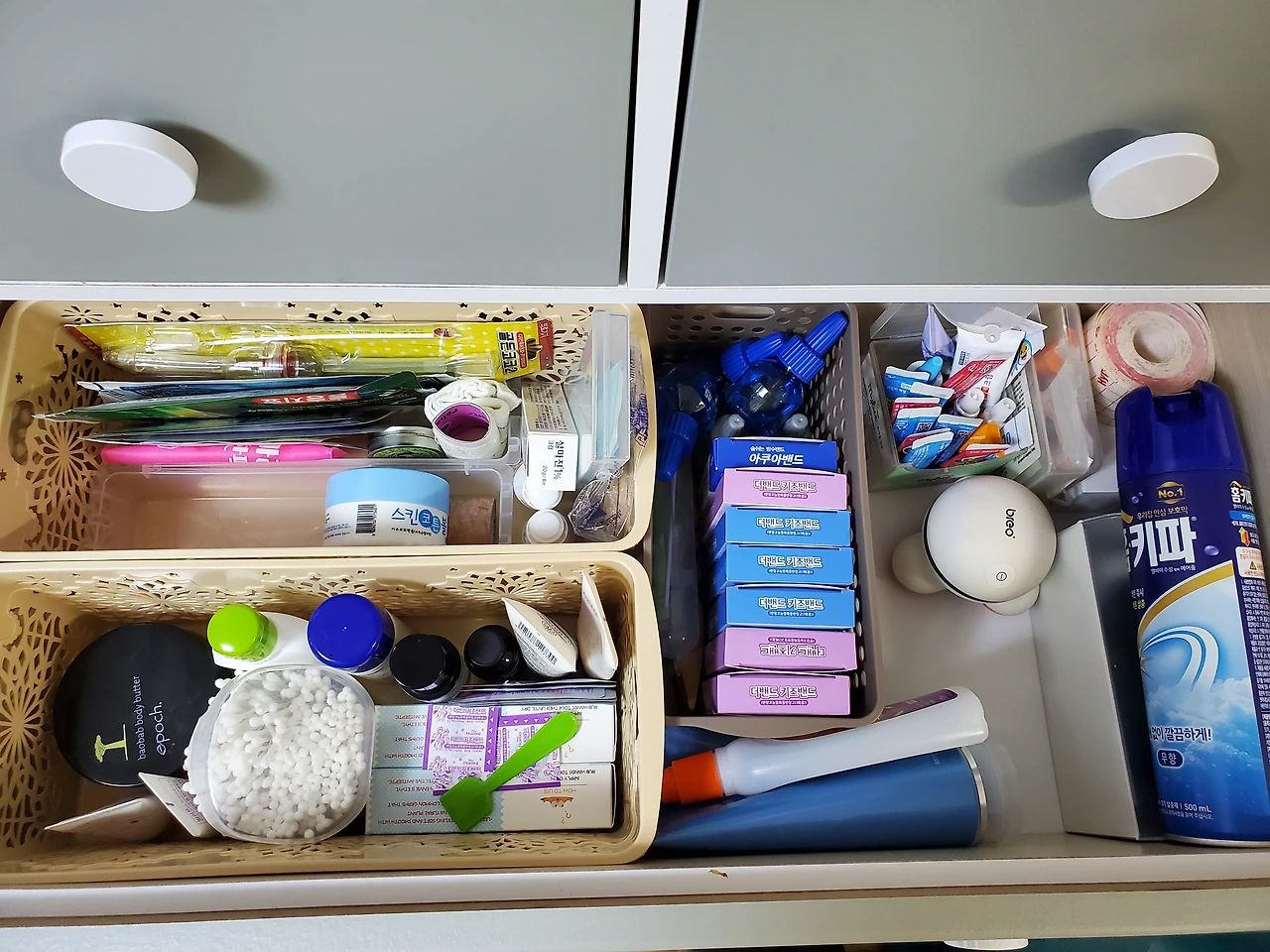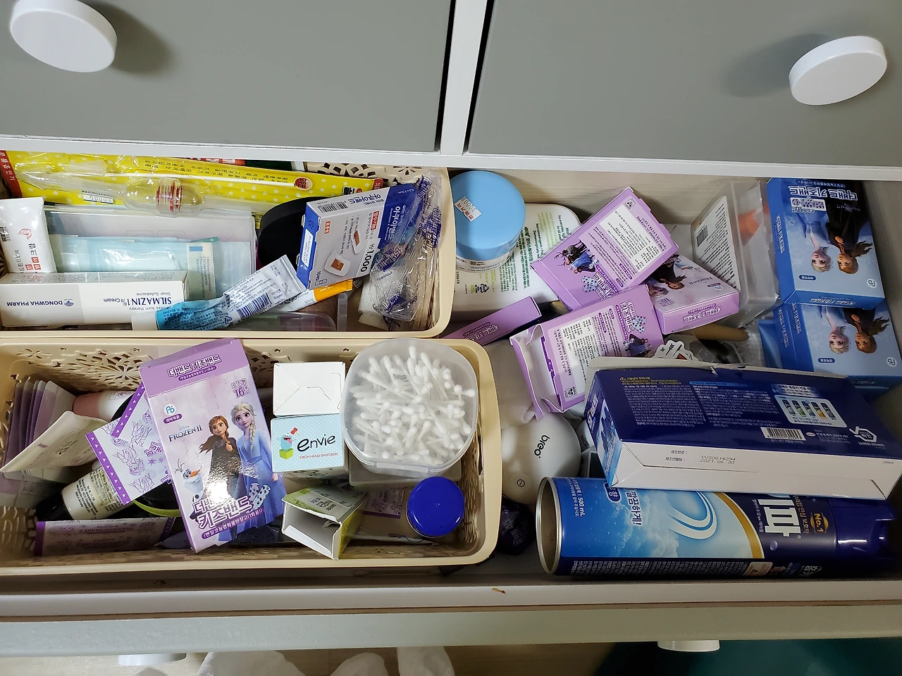 여기에는 비상약품과 아이 로션 등 보관하는 서랍장이다. 근데 올여름부터 여기는 엉망진창이 되어 찾아야 하는 물건은 어디에 숨었는지 찾을 때마다 숨바꼭질을 했다.