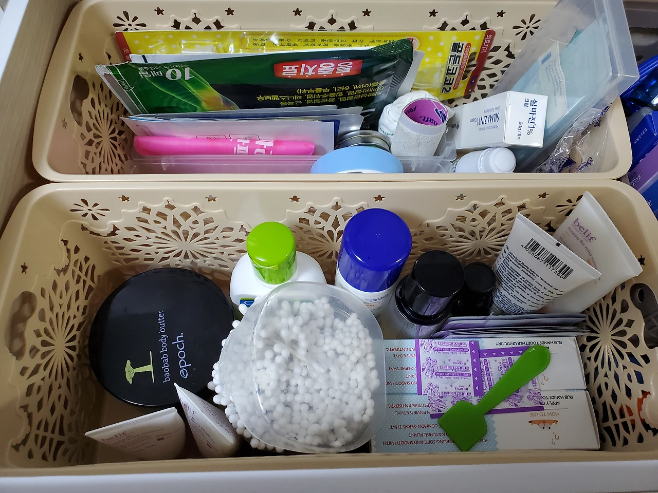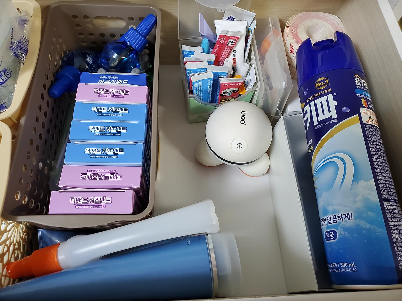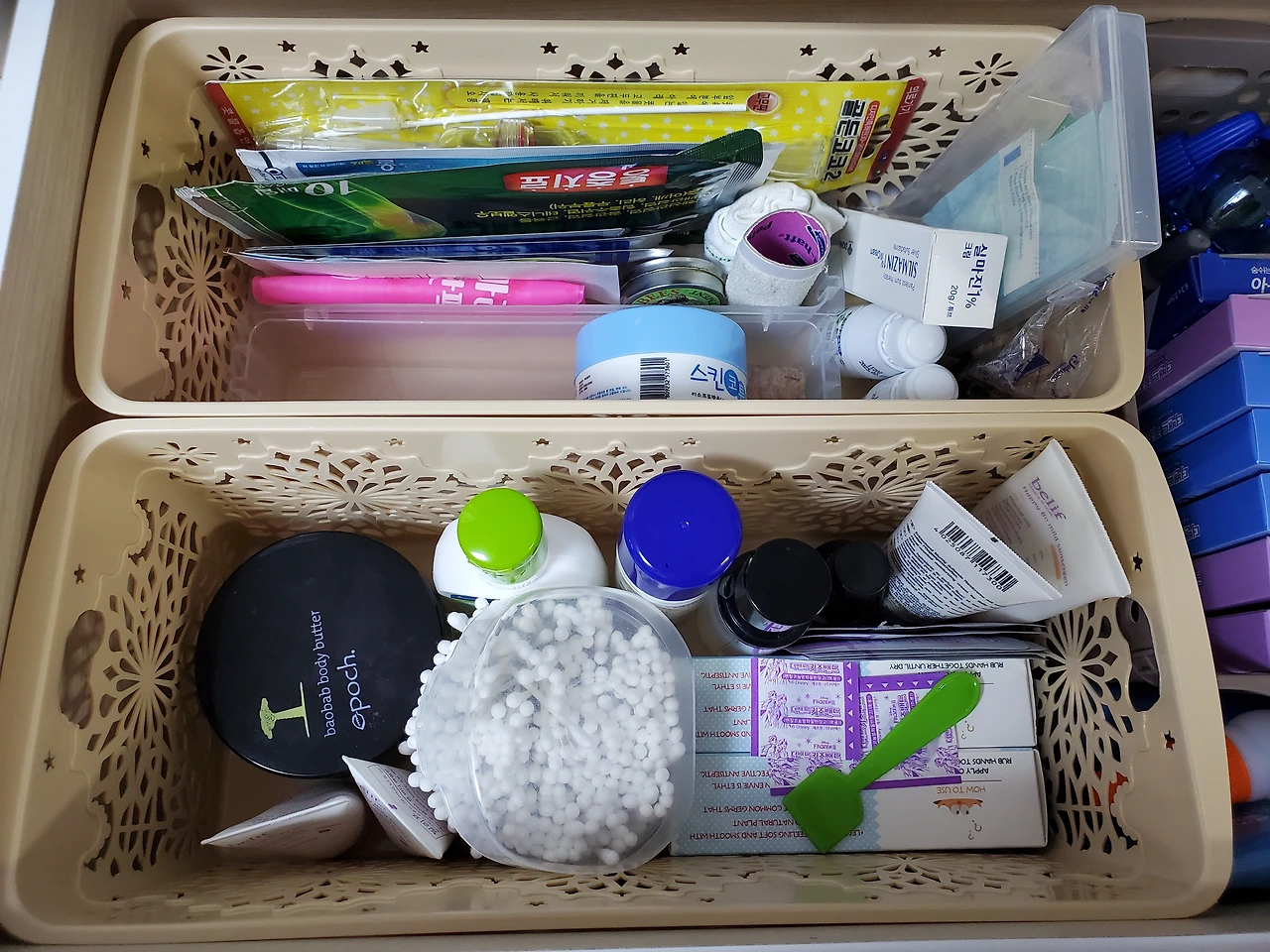 여기에는 비상약품과 아이 로션 등 보관하는 서랍장이다. 근데 올여름부터 여기는 엉망진창이 되어 찾아야 하는 물건은 어디에 숨었는지 찾을 때마다 숨바꼭질을 했다.