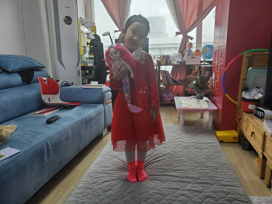 피아노 학원 가기 전 산타 언니가 되고 싶다고 했다. 겨울 원피스를 뒤져 빨간색 원피스를 골라 입혀 주었더니 너무 만족했다.
