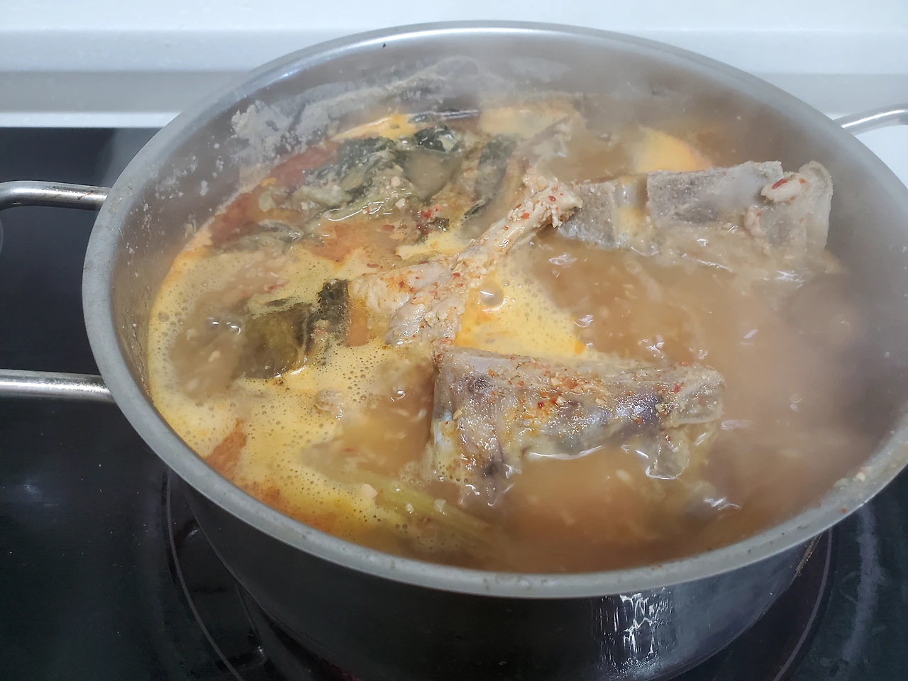 한 번 끓인 등뼈를 찬물에 씻어 육수와 물을 섞어 냄비에 붓고 등뼈와 된장을 풀고 푹 끓어주면 된다.