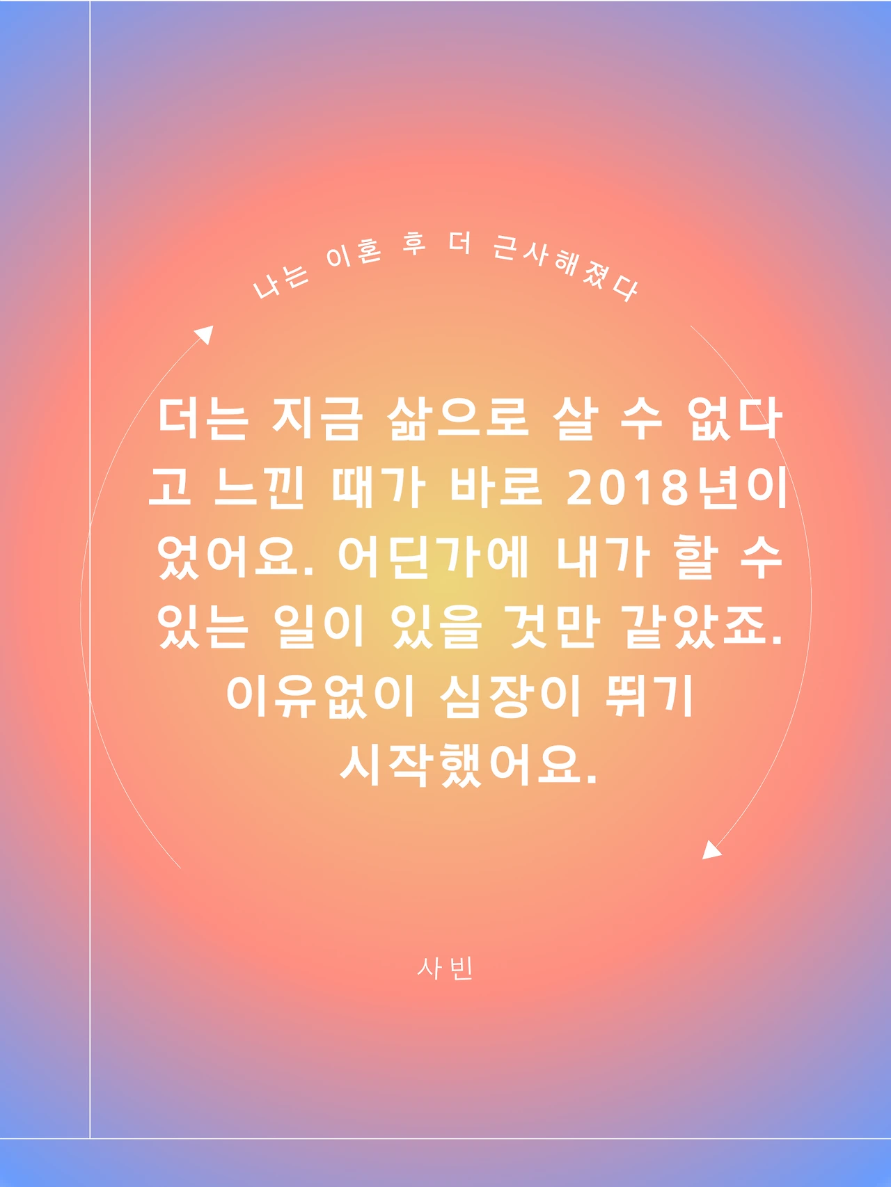 '더는 이렇게 살 수 없어!' 마음의 소리, 내면의 소리가 제 귓가에 맴맴 돌았어요.