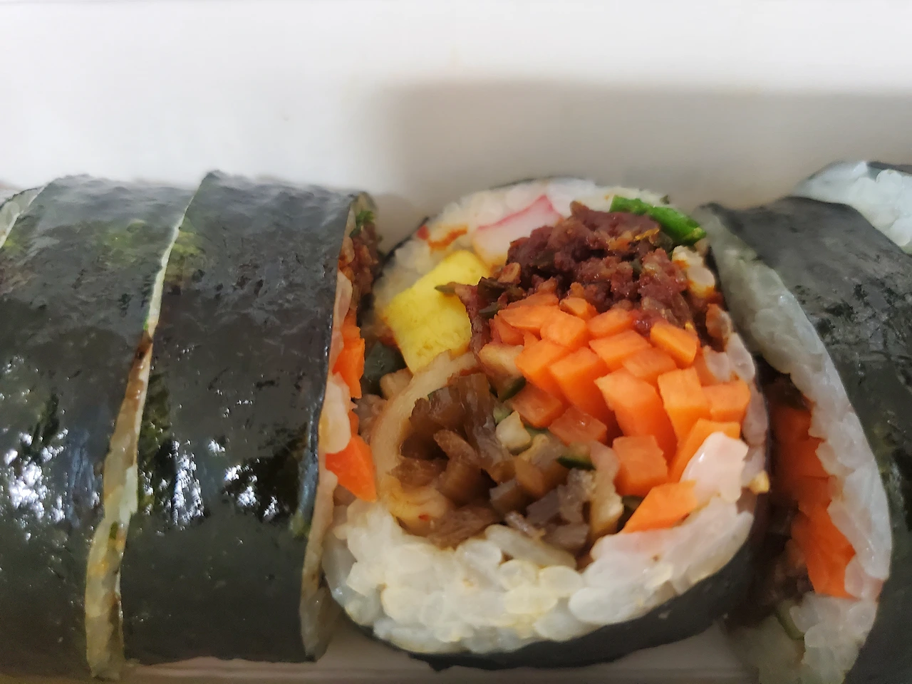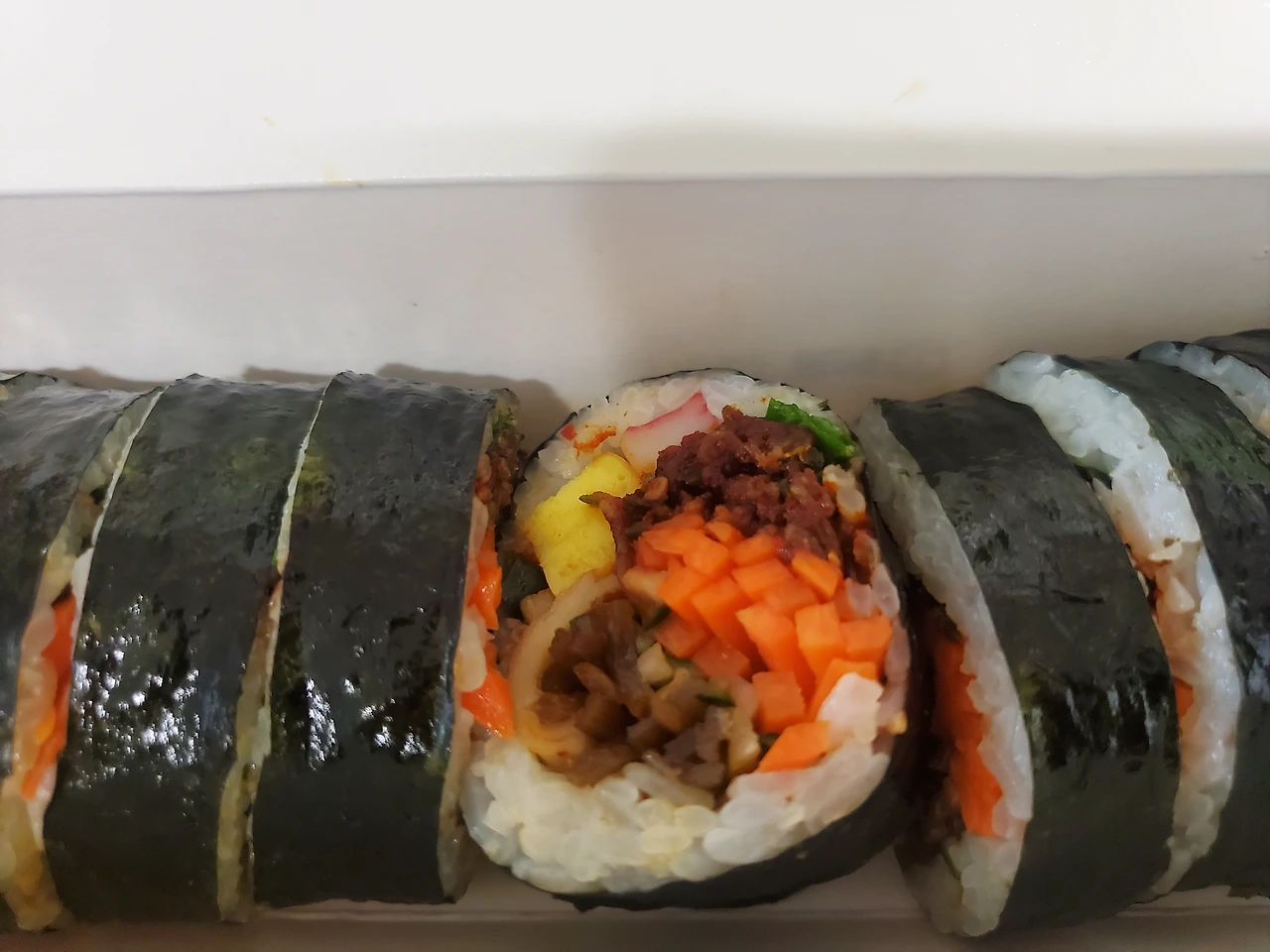 저는 병원비도 무료라 딸이 좋아하는 간식을 사고 기운 차리려고 김밥 한 줄 포장했어요. 요즘 김밥 한 줄이 5천 원 하네요. 이러니 고물가라고 하나 봐요. 김밥 한 줄 먹고 나니 든든합니다.