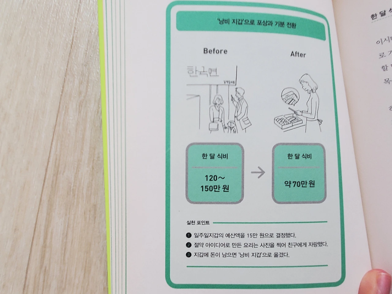 저자는 지갑에 현금을 넣고 영수증을 받아 하루치 소비를 기록하라는 거 같아요. 현금은 그래야 하지만 체크카드로 사용하게 되면 굳이 가계부 기록이 필요 없어요.
