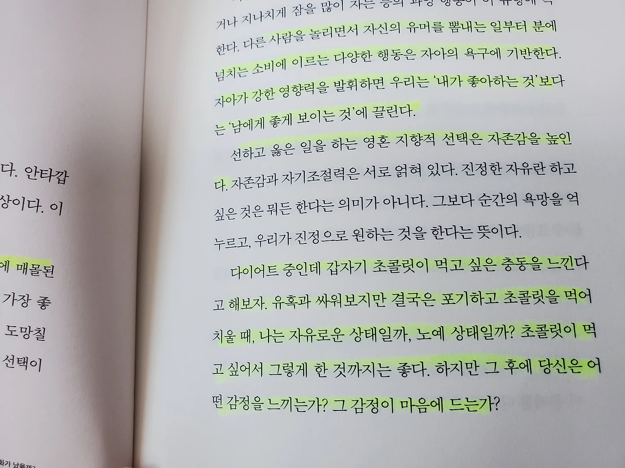 다이어트 중인데 갑자기 초콜릿이 먹고 싶은 충동을 느낀다고 해보자. 유혹과 싸워보지만 결국은 포기하고 초콜릿을 먹어 치울 때, 나는 자유로운 상태일까, 노예 상태일까? 초콜릿이 먹고 싶어서 그렇게 한 것까지는 좋다. 하지만 그 후에 당신은 어떤 감정을 느끼는가? 그 감정이 마음에 드는가?