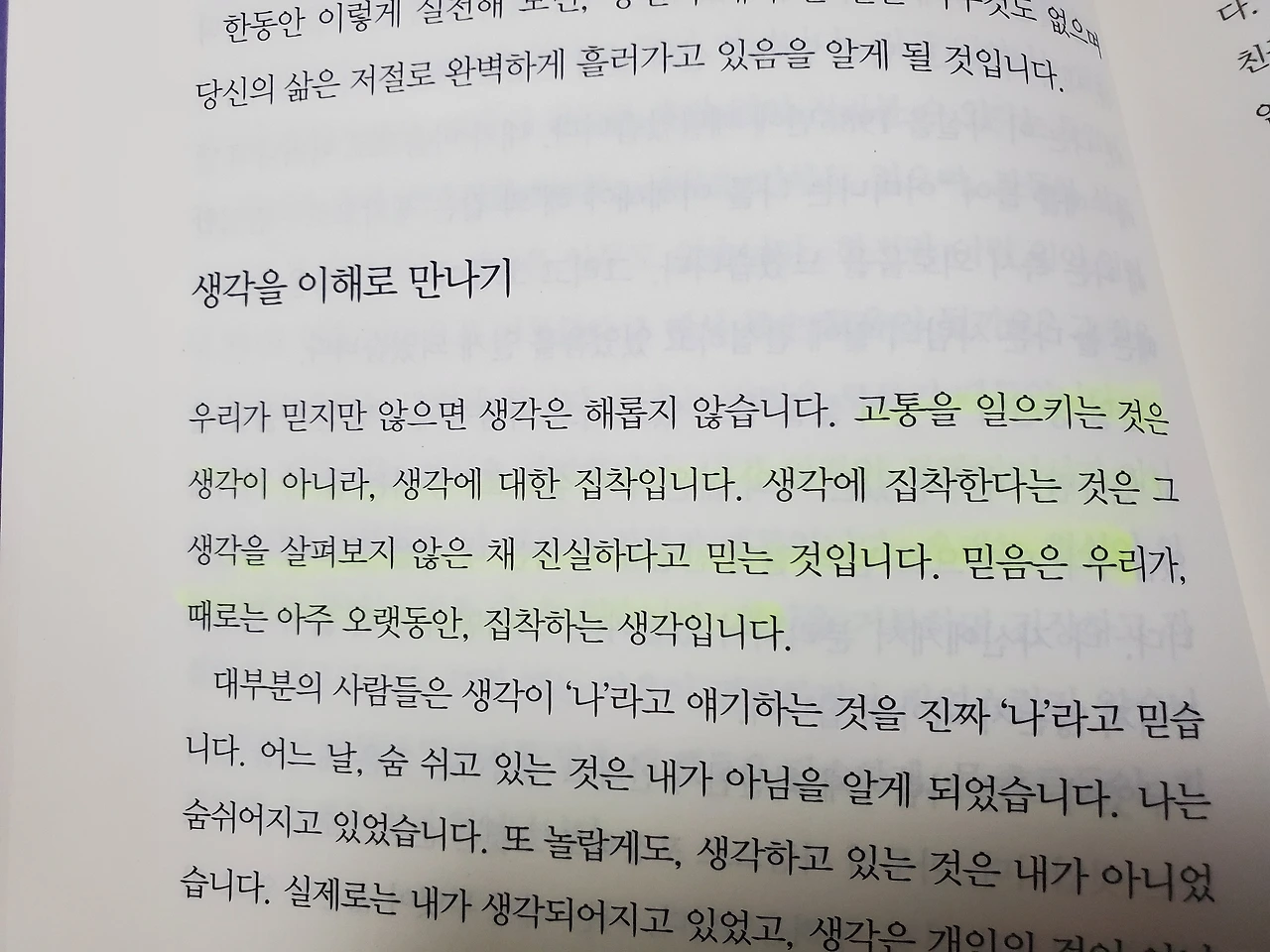 고통을 일으키는 것은 생각이 아니라, 생각에 대한 집착입니다. 생각에 집착한다는 것은 그 생각을 살펴보지 않은 채 진실하다고 믿는 것입니다. 믿음은 우리가, 때로는 아주 오랫동안, 집착하는 생각입니다.