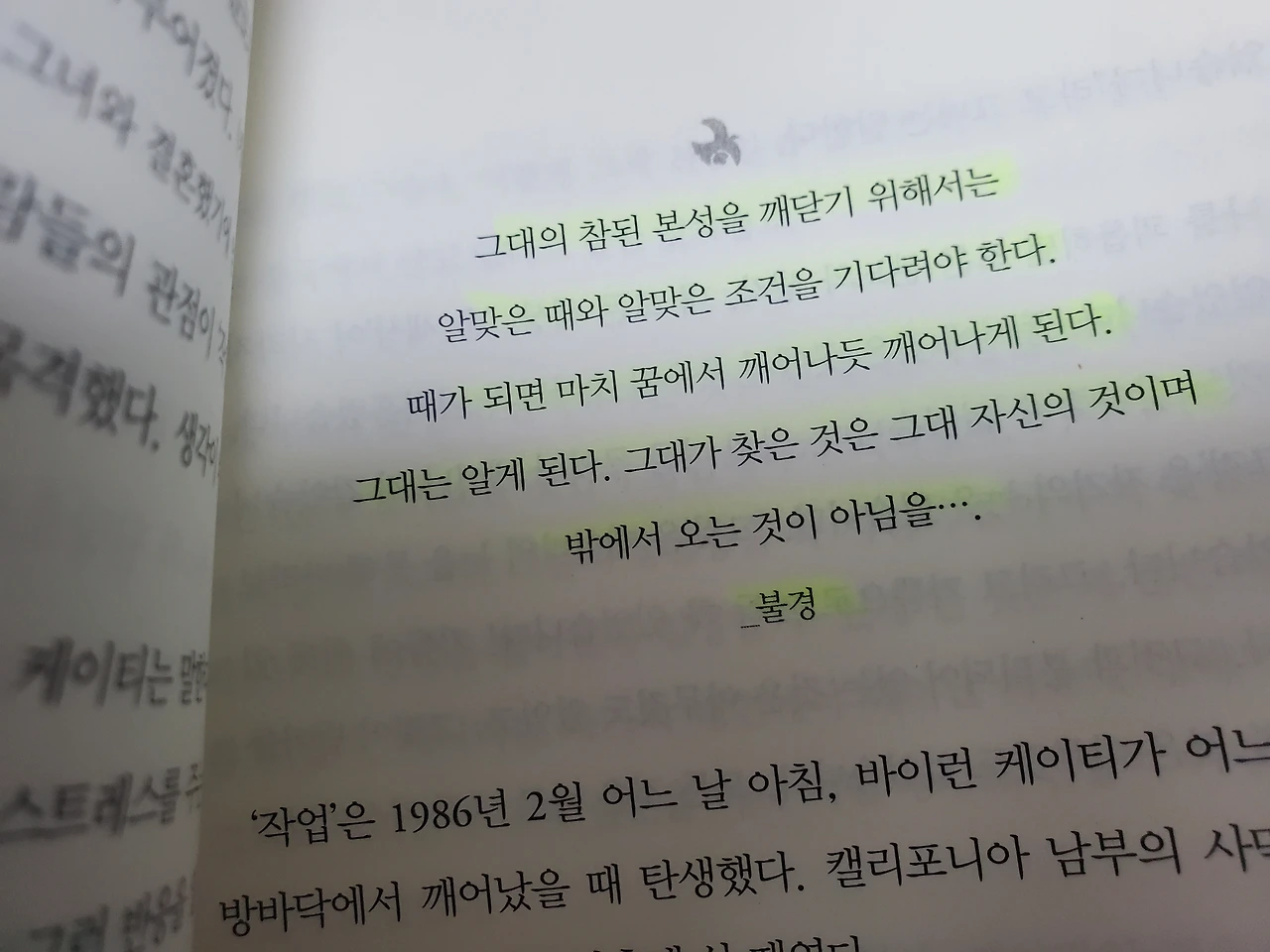 그대의 참된 본성을 깨닫기 위해서는 알맞은 때와 알맞은 조건을 기다려야 한다. 때가 되면 마치 꿈에서 깨어나듯 깨어나게 된다. 그대는 알게 된다. 그대가 찾은 것은 그대 자신의 것이며 밖에서 오는 것이 아님을... 불경