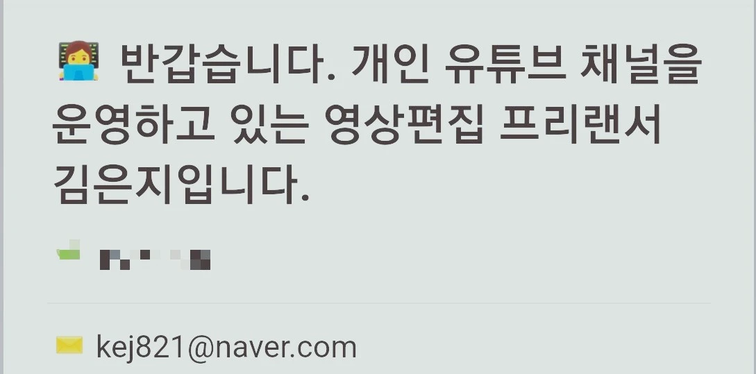 원고 작성과 채널 아트 및 업무 전반적인 일을 양도할 사람이 필요하다면 영상 편집자 김은지에게 문의해 보세요.