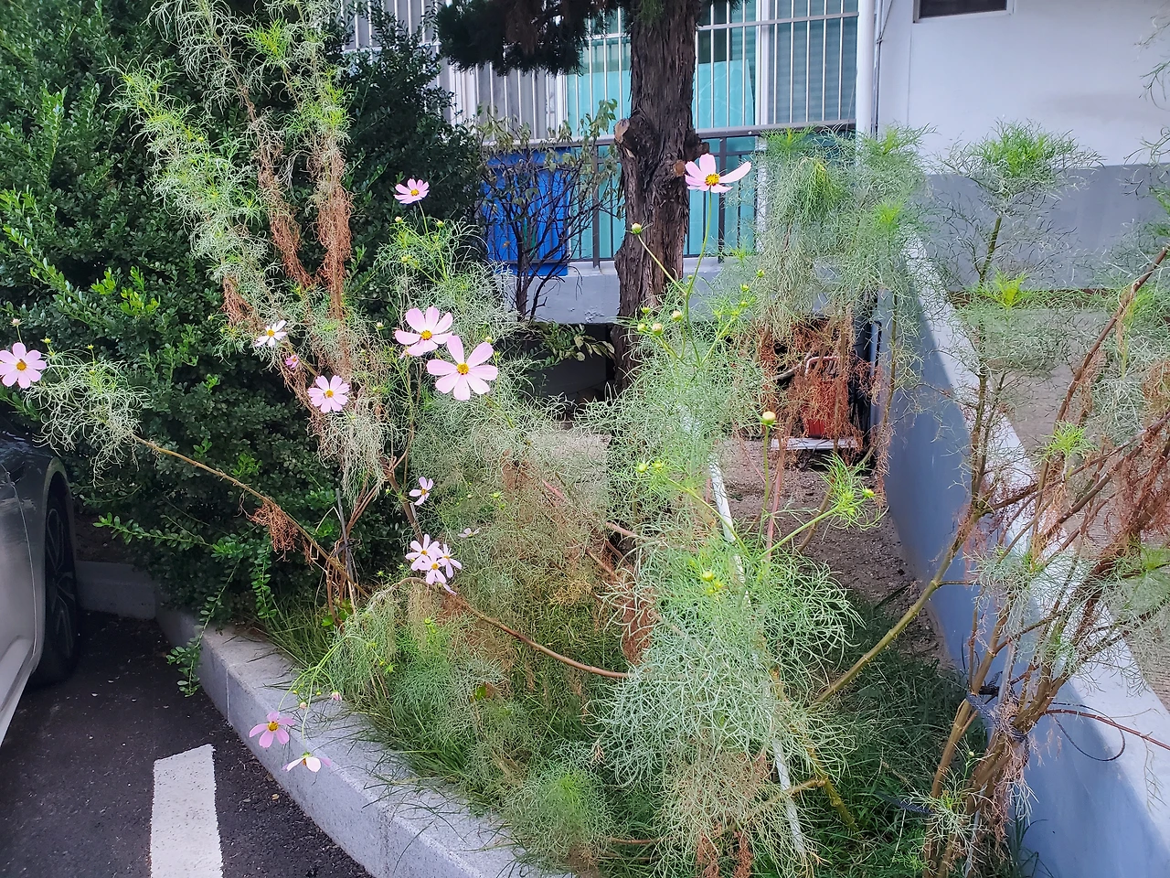 딸을 학원 차에 태워 학교로 보내고 집으로 가려는데 아파트 단지에서 홀로 핀 코스모스가 눈에 들어왔어요. 그냥 지나칠 그런 곳인데 그날따라 코스모스에 눈을 떼지 못했어요.