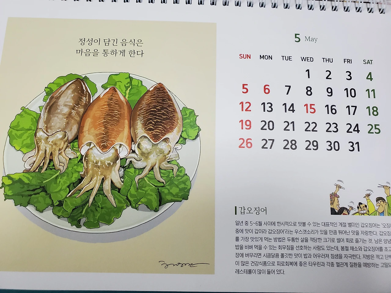 오늘 책 소개는 캘린더입니다. 캘린더를 보면 알겠지만 매일 식단으로 고민이 될 때 허영만 식객 캘린더를 보면 걱정을 날려요. 쉽게 음식을 해결할 수 있어요.