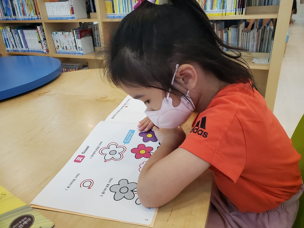 며칠 있다 다시 찾은 도서관에서 그림책을 보는 딸입니다.