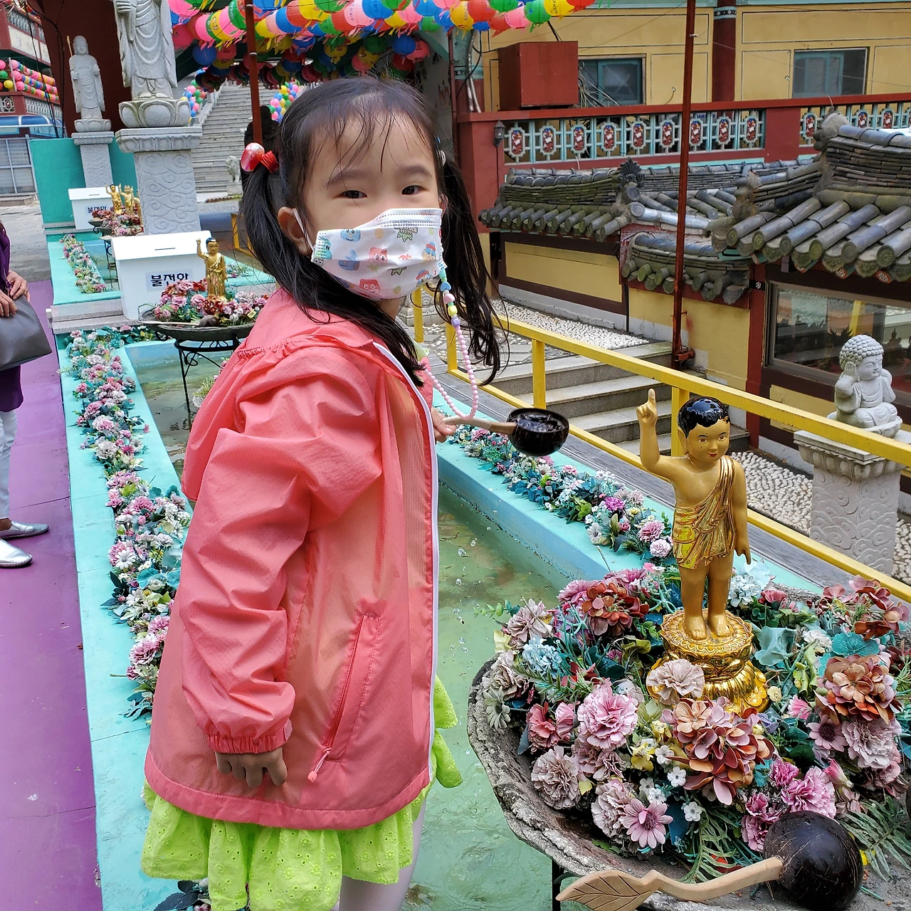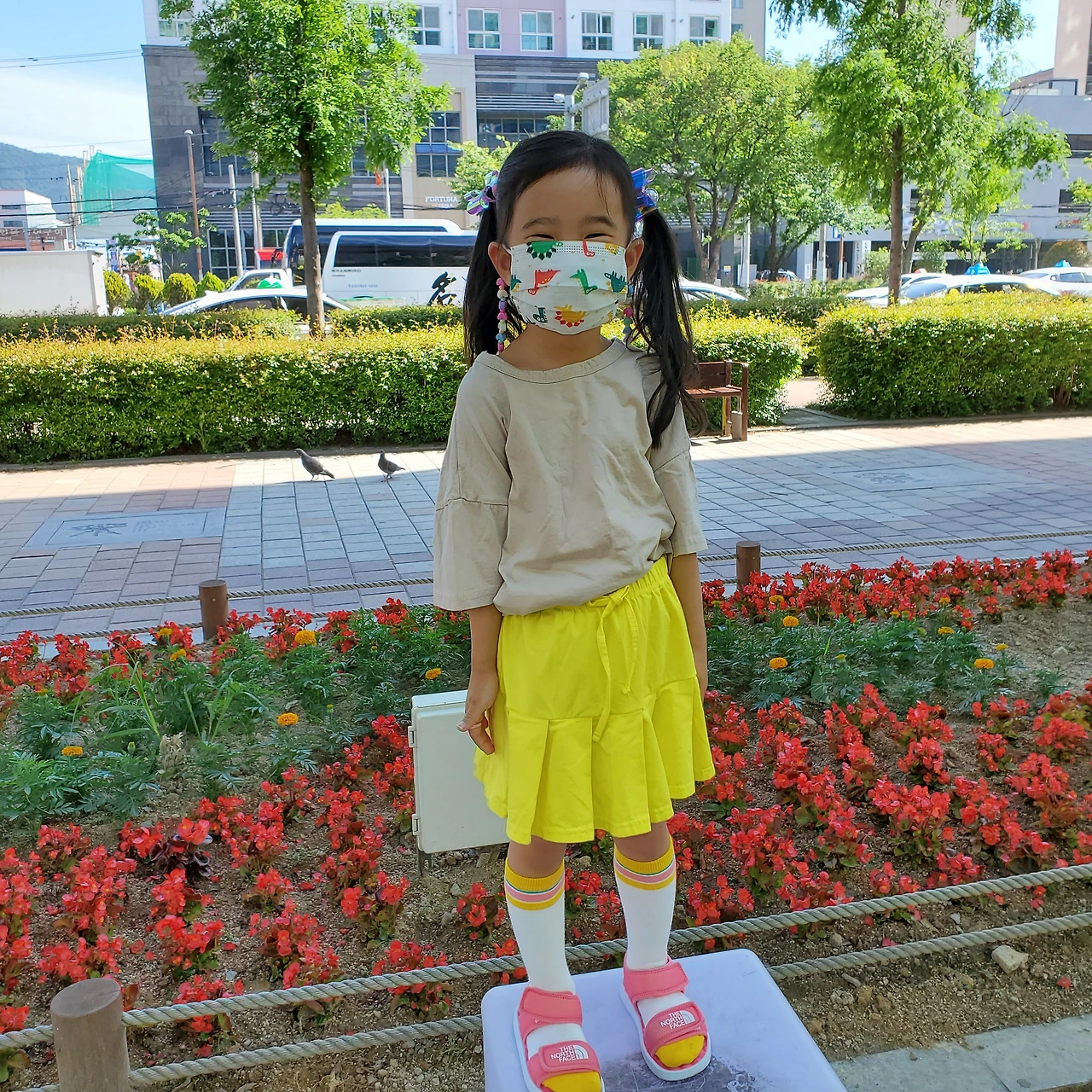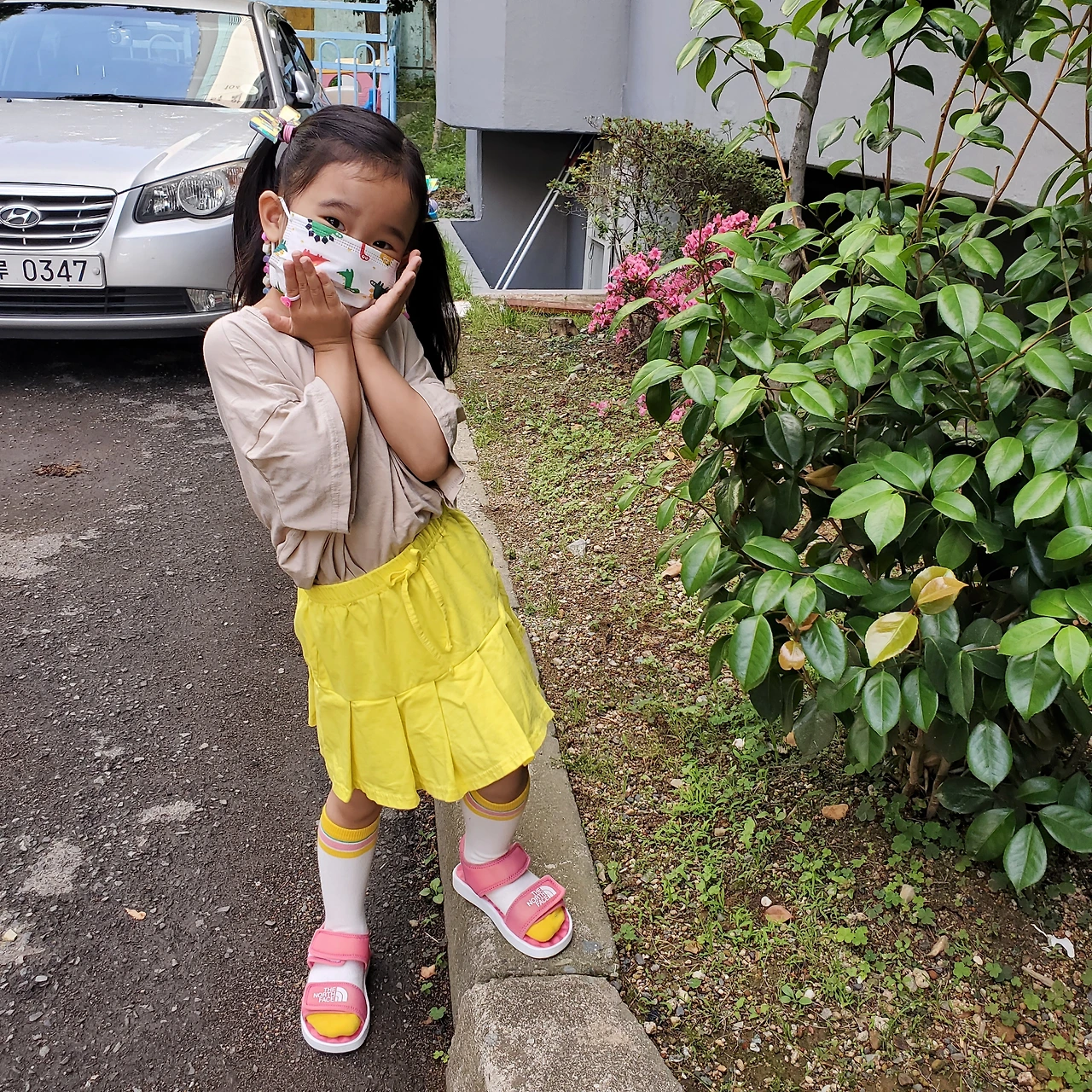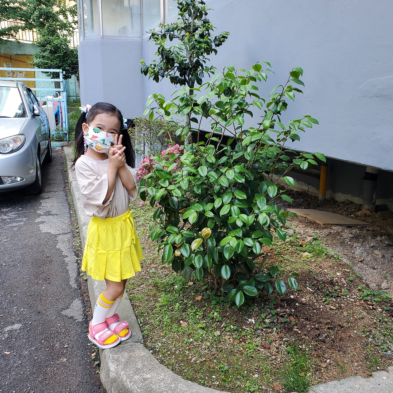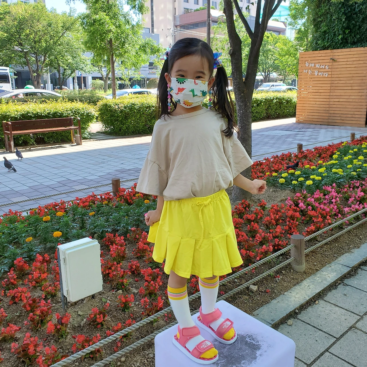 꽃 옆에서 사진 찍고 싶다고 말하는 딸을 찍어주며 "꽃보다 네가 더 이뻐"라고 말하니 배시시 웃어요.