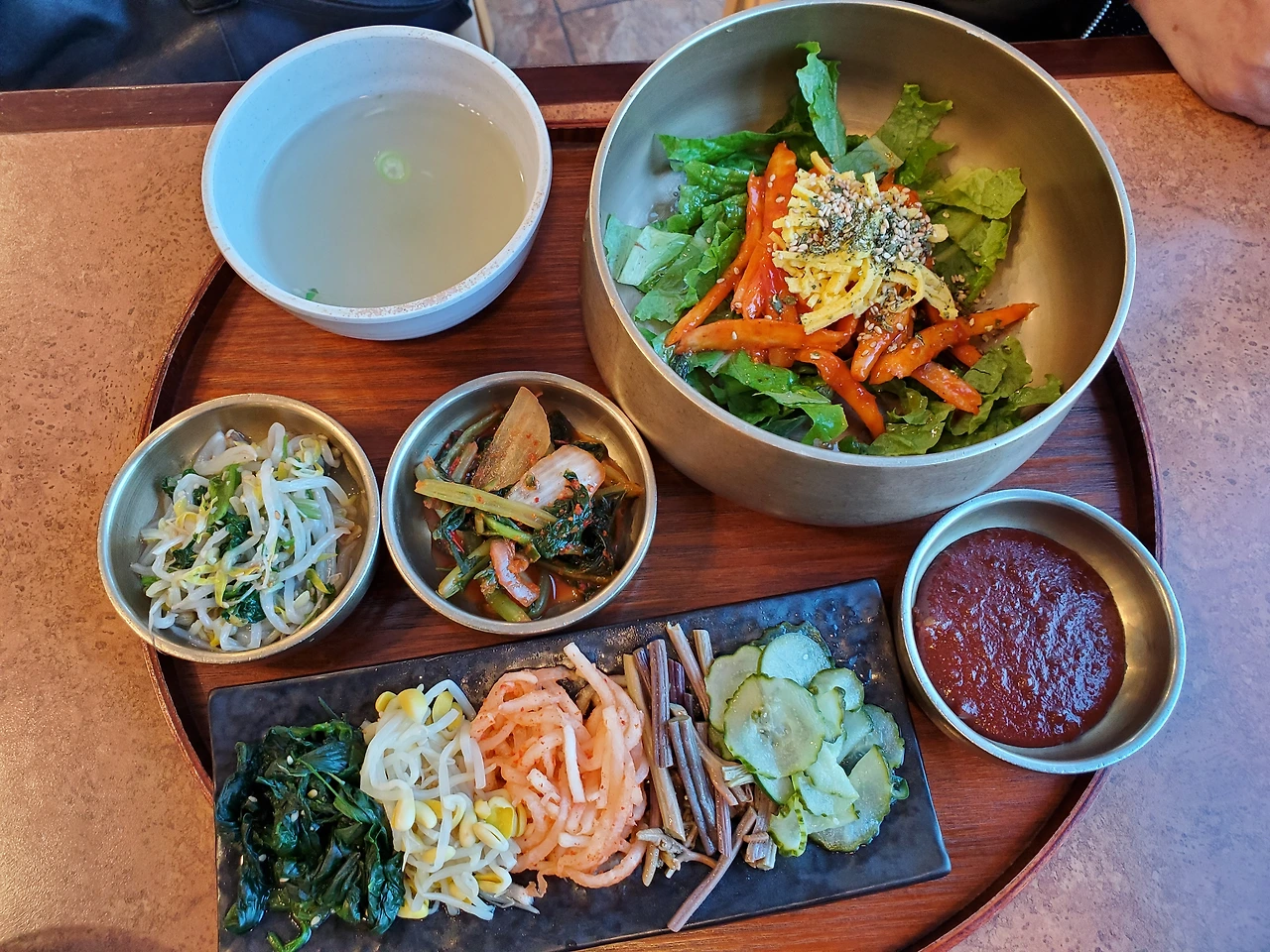 바로 삼색 비빔밥이에요. 담백하면서도 소화가 잘 될 거 같아서 주문했어요. 맛은 담백하면서도 맛깔스러웠어요.