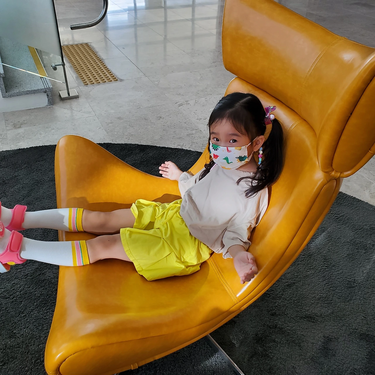 새로운 의자에 앉아 체험해 보는 딸.