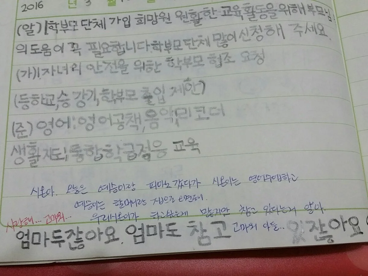 학교에 가서 하루 일과가 끝나고 알림장을 폈을 때 엄마의 칭찬과 사랑한다는 말이 아이들의 하굣길에 가슴에 첫마디로 기억되길 바랐다.
