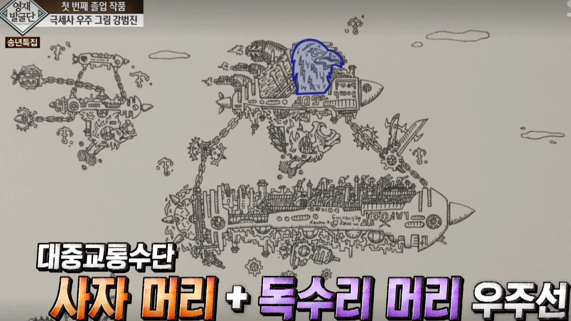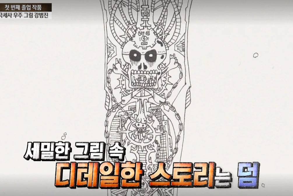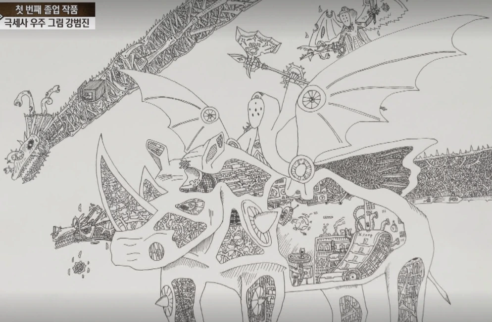 K는 영재 발굴단이라는 TV 프로그램에 출연한 그림 영재 '강범진'군을 기억한다. 그 아이는 우주와 관련된 기이한 그림을 몇 시간이고 몰입해서 그렸다. 오래된 이야기인데도 K가 기억하는 이유는 강범진 군이 그림을 그릴 때 머릿속에 켜지는 TV 때문이었다. 강범진 군은 머릿속 TV가 켜지면서 보이는 우주 이미지들을 도화지에 옮겨 그린다고 한다. 그림은 세밀하게 표현되어 있고 그 세밀화 하나하나에 스토리가 담겨 있다는 것이 놀라웠다.