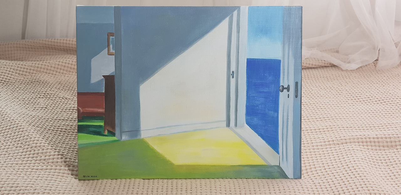 에드워드 호퍼의 <room by the sea>. 벽에 걸만한 명화 액자를 구경하다가 보자마자 <갖고 싶다>란 열망에 사로잡혀 오래된 아크릴 물감을 힘들게 짜며 그린 그림이다.