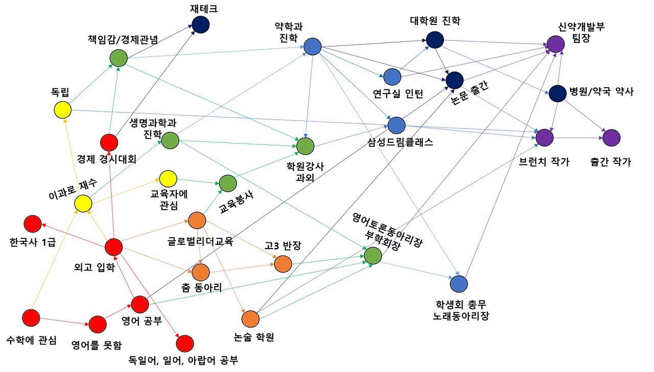 시간에 흐름에 따라 (빨->주->노->초-> 파-> 남-> 보) 찍어본 점어린 시절 결정했던 선택들이 당시에는 주변으로부터 잘못된 선택으로 평가받거나 무모한 도전으로 여겨졌었다. 이공계를 가고 싶었으나 영어 공부를 위해 어쩌다 외고에 진학했다. 그리고는 재수하면서 다시 이공계로 전향하여 수능을 보기도 했다. 이공계 전향에 실패했을 때 많은 이들의 비웃음거리가 되기도 했다. 하지만 좌절하지 않고 믿음을 가지고 점을 찍어나갔다. 초기에는 우려의 시선으로 보였으나 꾸준히 찍어가다 보니 나의 선택들이 어느 순간 강점이 되어 남들과 다른 차별성을 키워주었다. 모든 점들 중 아직 빛을 발하지 못한 것들은 있으나 분명 미래에 이어지는 선이 생길 것이다.