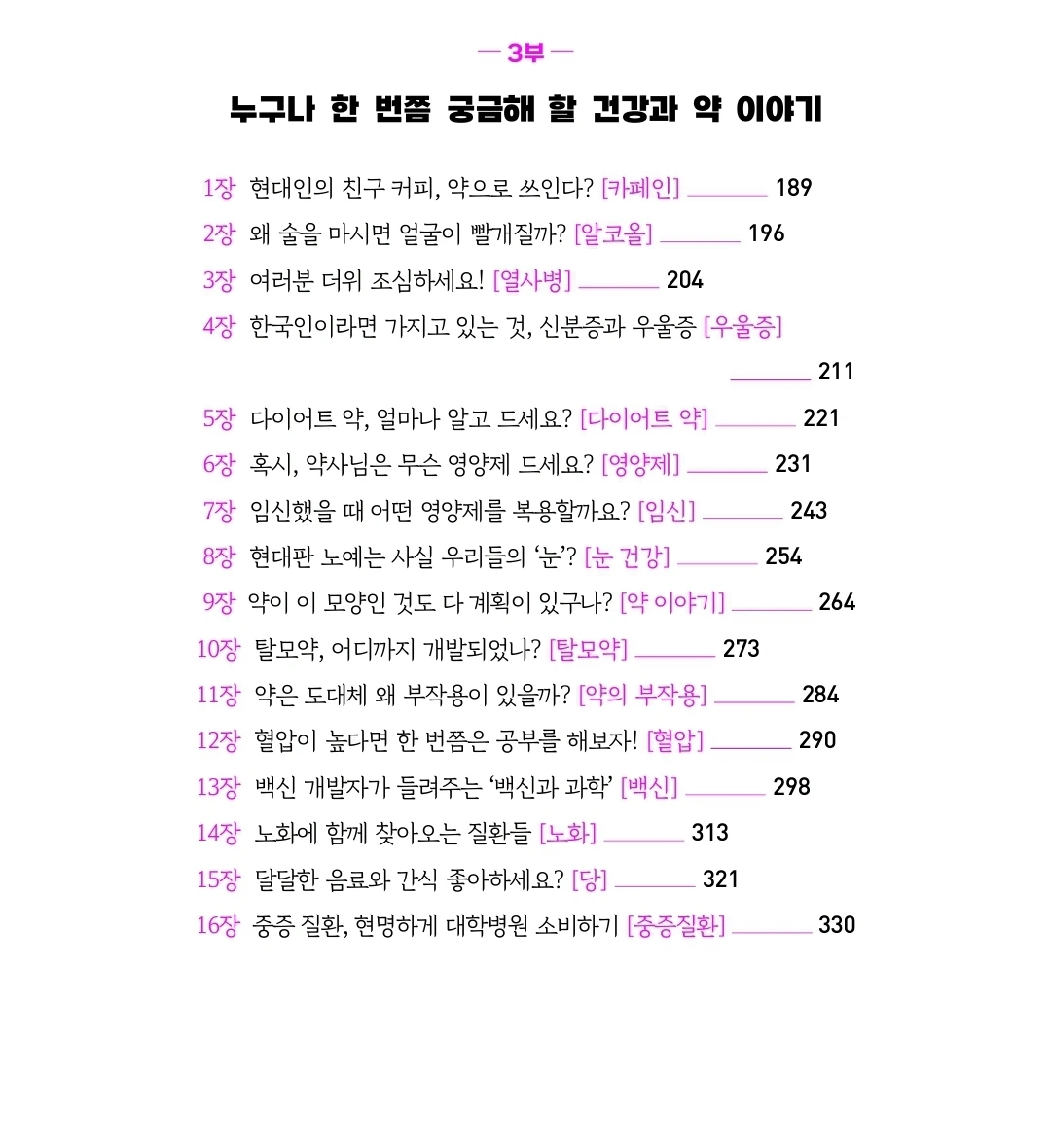 책은 3부로 나뉘어있고, 각각 12, 11, 16 장(총 39장)으로 구성되어있다 (총 346 page). 39장 중 14개의 이야기를 메거진으로 발행하였을 때, 어려운 글임에도 조회수가 골고루 높게 나온 것을 보고 많은 사람들이 건강에 관심이 많다는 것을 새삼 느끼게 되었었다.