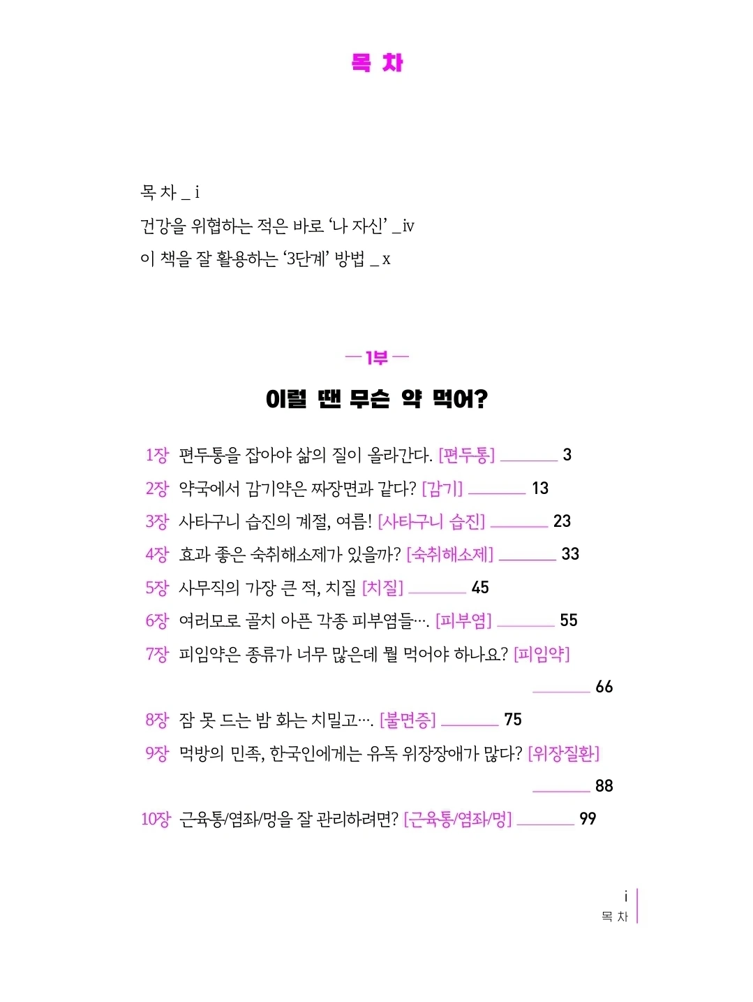 '에세이 + 건강서적 + 응급 사전'의 역할을 모두 담기 위해서 책은 3 단계로 나누어서 구성하였다. 가볍게 읽을 때에는 에세이에 해당하는 부분을 읽고, 질환에 대해 공부하고 싶을 때는 건강서적 부분을 읽고, 급하게 찾아볼 때에는 핵심 요약을 읽으면 된다.