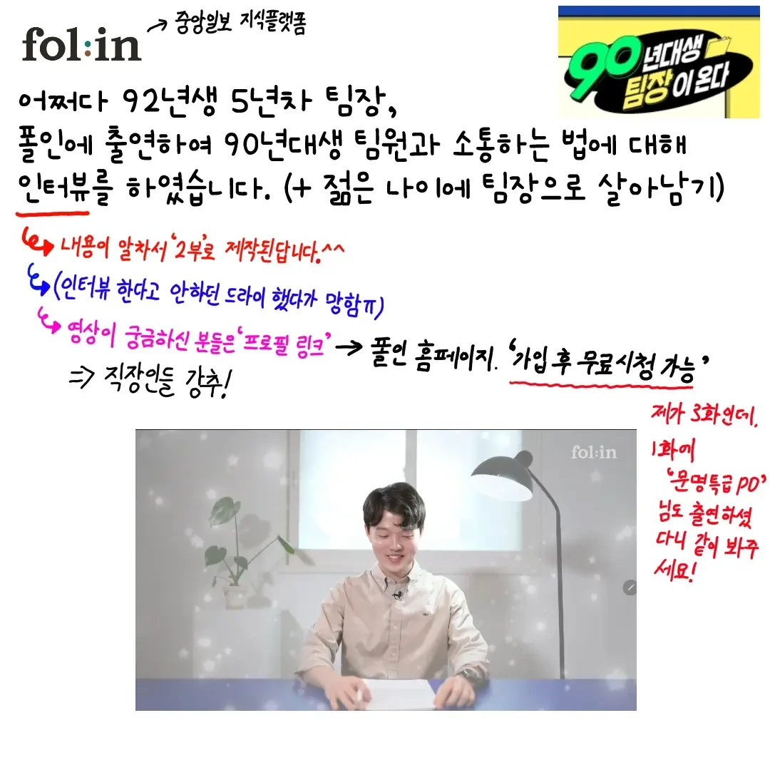 저 외에도 문명특급 PD와 존슨앤존슨 팀장도 출연했다고 하니 다른 90년대생 팀장들의 영상도 만나보실 수 있답니다.