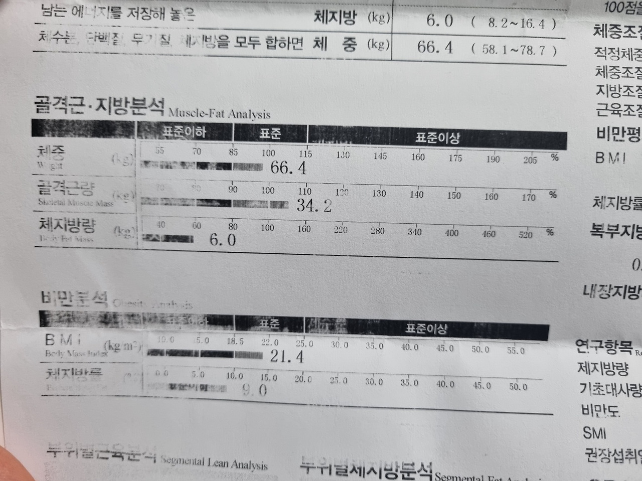 <2023년 7월 24일> 키 176.3 cm, 체중 66.4 kg, BMI 21.4, 골격근량 34.2 kg, 체지방량 6.0 kg.