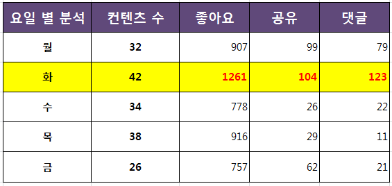 요일 별 콘텐츠 개수를 비교했을 때, 주말을 제외한 월-금요일에 골고루 분포되어 있음을 알 수 있었습니다.