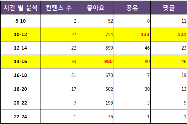 또한, 시간대로 분석해보면 오전 10시-12시와 오후 2시-4시에 업로드한 콘텐츠의 Engagement가 가장 높았습니다. 오전 10시-12시에 업로드한 콘텐츠의 경우 유저가 점심시간에 휴식을 취하며 페이스북에 접속하는 경우가 많기 때문에 자연스럽게 마켓컬리의 콘텐츠로 유입되는 것으로 판단되며, 오후 2시-4시에 업로드한 콘텐츠는 직장인이 허기를 느끼는 시간이 오후 4시라는 실험 결과와 저녁식사를 생각하는 시점이라는 것에 영향을 받았다고 판단됩니다.