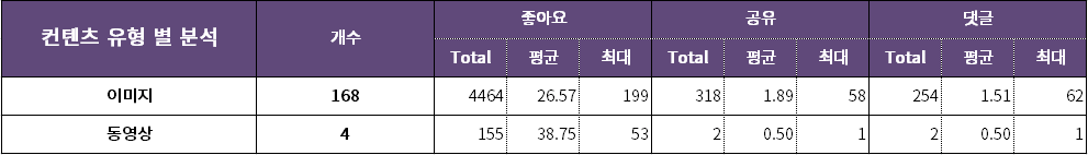 콘텐츠 유형별로 살펴보면, 거의 모든 콘텐츠가 이미지 중심으로 구성되어 있음을 확인할 수 있었습니다.