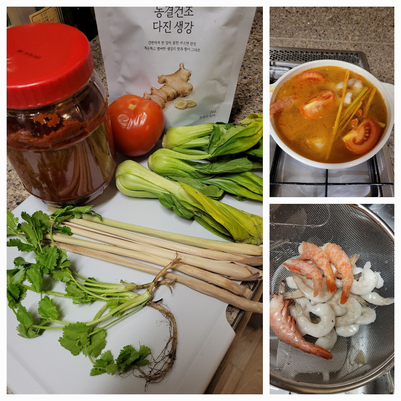 재료: 똠얌 소스, 레몬그라스, 고수, 토마토, 버섯, 레몬, 생강