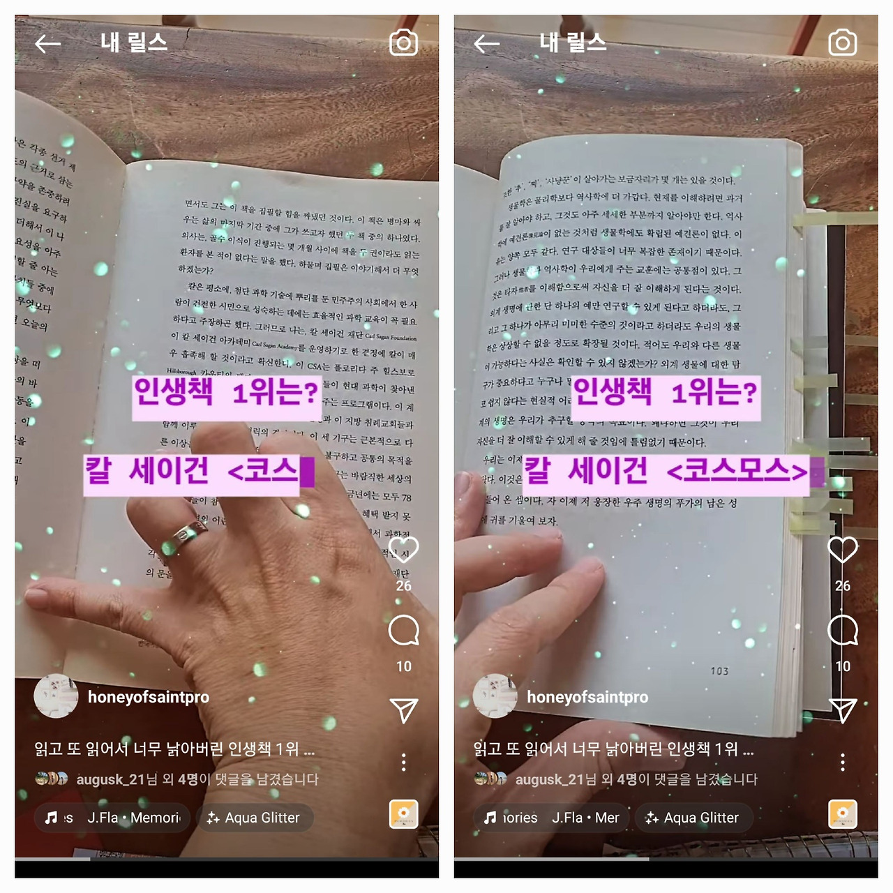 이 모든 생각들이 스쳐 지나가는 그 순간. 머리보다 빠른 손은 동영상 찍을 준비를 하고 있다. 좋아하는 걸 해야 오래 한다니까 주제를 책으로 정해보자. 그럼 내가 좋아하는 책 1위를 해보면 되겠군. 오랫동안 읽어온 책이라면 칼 세이건의 <코스모스>지. 마침 이 책으로 수업을 하고 있으니 딱이다.