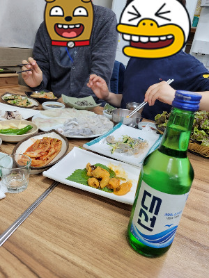 7시 반쯤 가게에 도착했는데 가게 안에 사람이 그득했다. 자리가 없는 줄 알고 우물쭈물 서 있는데 아주머니가 웃으며 "응, 왜 왔어?" 하신다. 회 먹으러 왔다고 하니 그럼 횟집에 회 먹으러 왔겠지 하신다. 뭔가 식은땀이 살짝 났지만 저쪽으로 가서 앉으라니 또 우리 네 명은 신나서 발걸음이 들썩들썩한다.