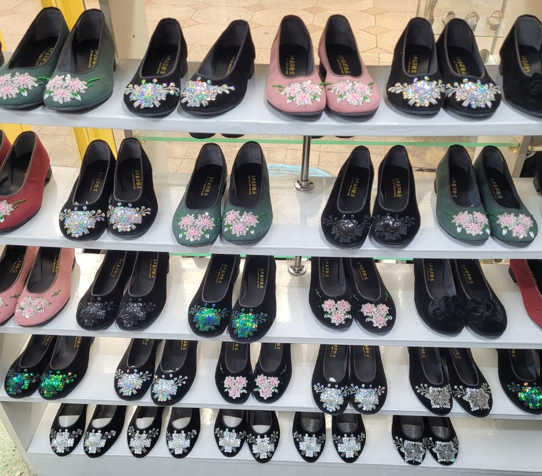 의흥덕 양화점의 대표 디자인은 납작한 중국식 구슬 신발이다. 구슬 장식은 한 땀 한 땀 여사장님이 만드시는데 아직 나는 직접 본 적은 없지만 만들어 놓은 장식을 보면 정성과 실력이 대단하다. 장인이 만든 구슬 장식이 구두 앞코에 붙여지면 평범한 벨벳 구두가 반짝 빛난다. 장식 모양도, 색깔도 다양해서 취향대로 고를 수 있다.