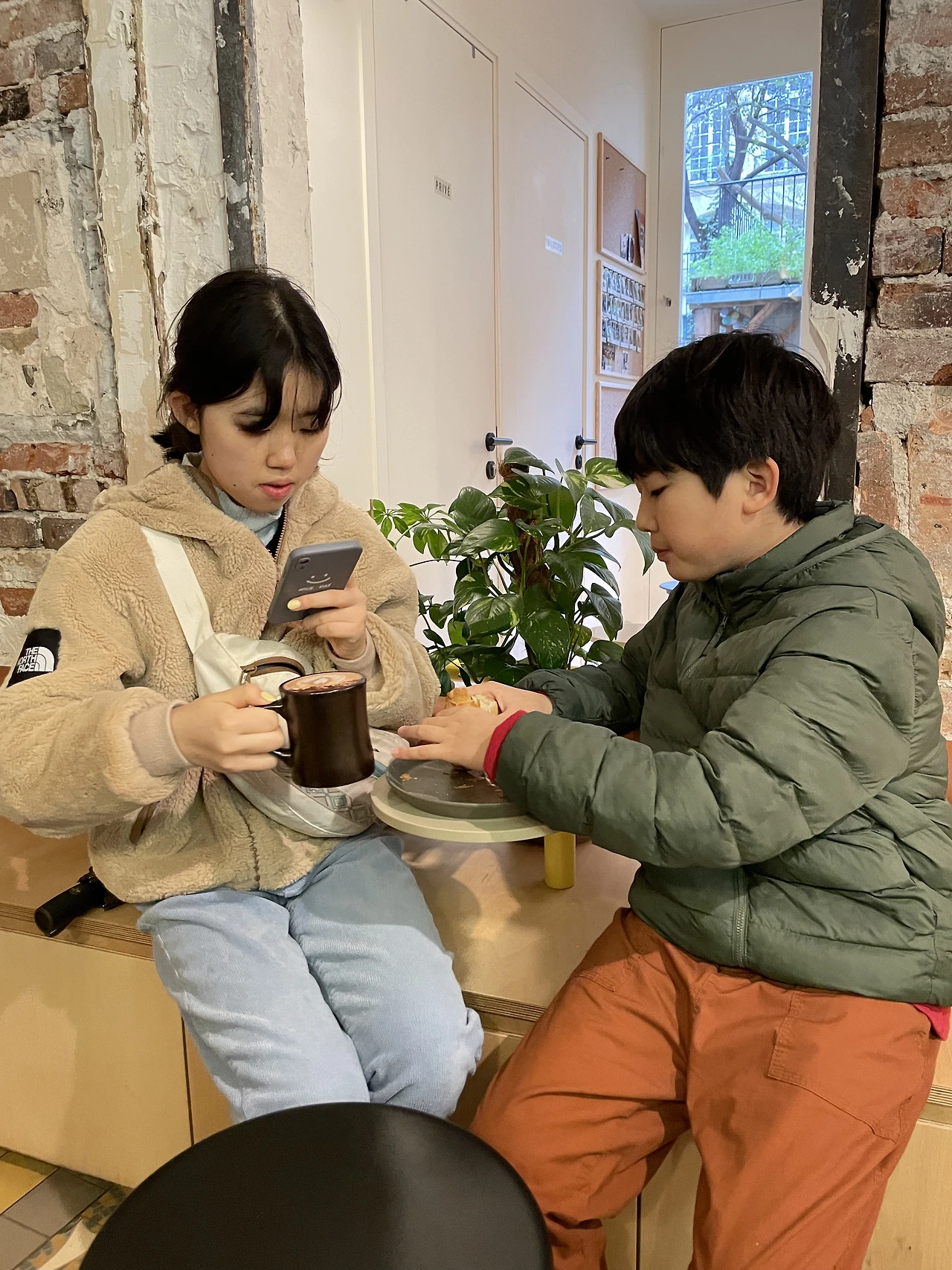 보주 광장을 나와 노트르담 성당 방향으로 길을 찾아 걸었다. 날도 춥고 보슬비가 부슬부슬 내리고 있어, 아이들의 컨디션이 걱정이 되었다. 가져온 비옷을 입히고 우산도 꺼내 썼다. 따뜻한 코코아 한잔이 생각나는 차에 가는 길에 있는 카페를 발견하고 들어갔다. 워니가 좋아하는 -여행 와서 좋아하게 된, 그래서 여행 다니는 내내 빵은 그것만 먹었다는- 뺑오쇼콜라 하나와 코코아 2잔, 그리고 내가 마실 커피를 한 잔 주문하고 파리에서의 첫 카페를 경험한다.