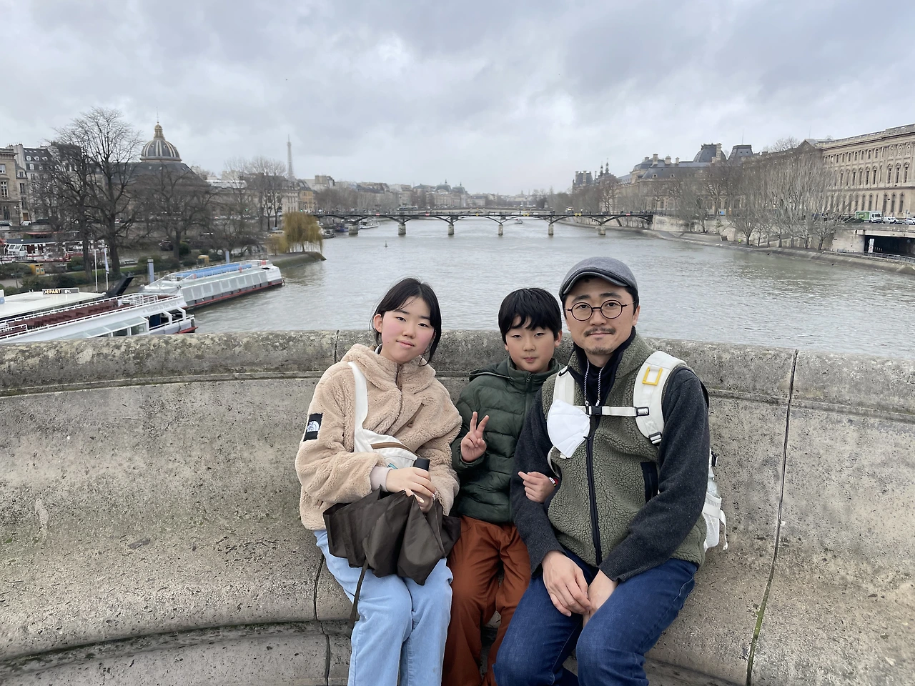 그래도 이번에는 아이들이 보채니 못 이긴 척 자리를 잡아본다. 퐁뇌프 다리에는 다리 위에 반원형 발코니가 있는데 거기에 길 가던 사람들이 쉬어 갈 수도 있고, 예전에는 그 발코니에 노점 상인들이 천막을 치고 장사를 하기도 했다고 한다. 아이들과 발코니에 자리를 잡고 포즈를 취했다. 역시, 사진 속 나는 어색하다.