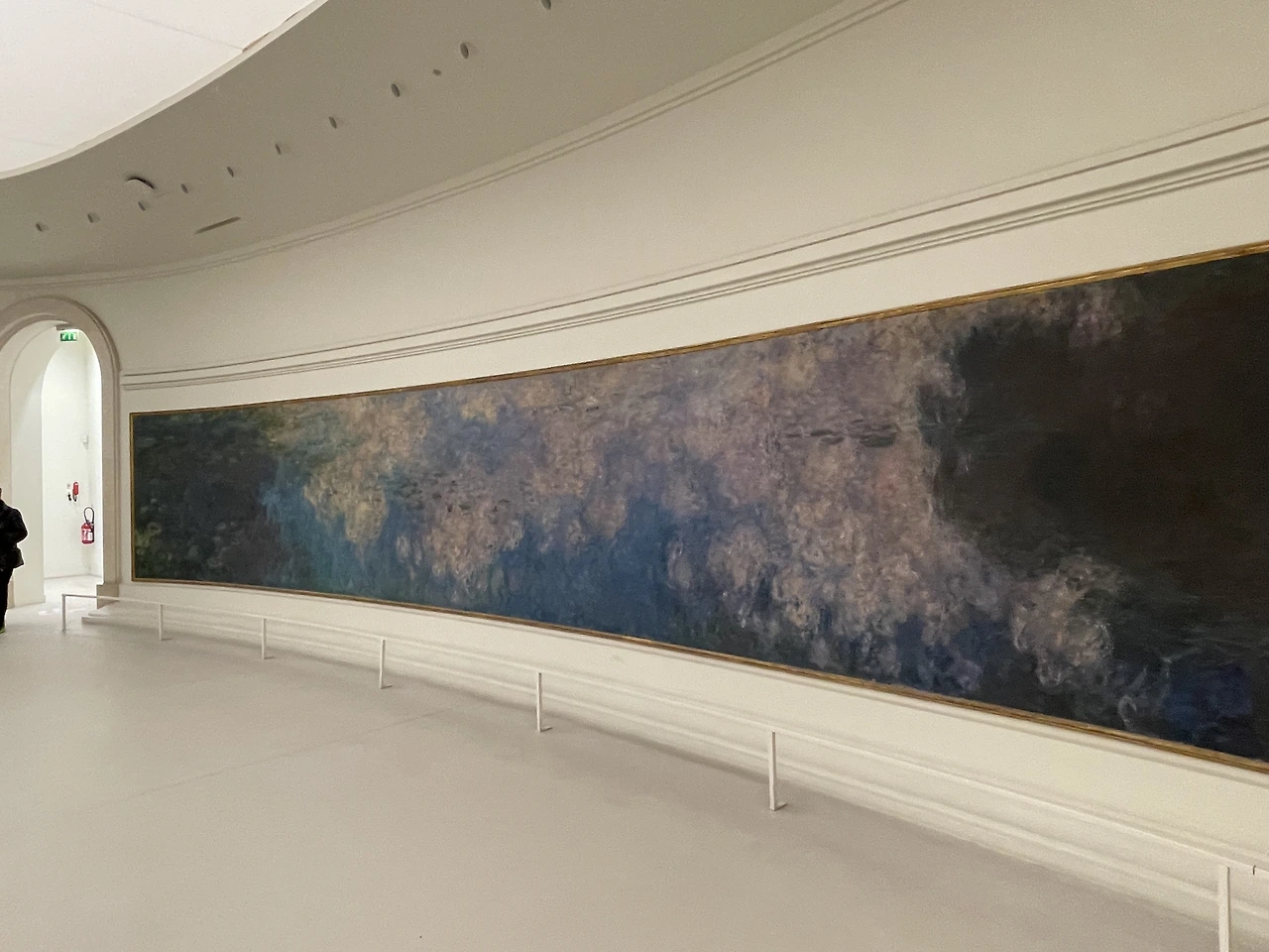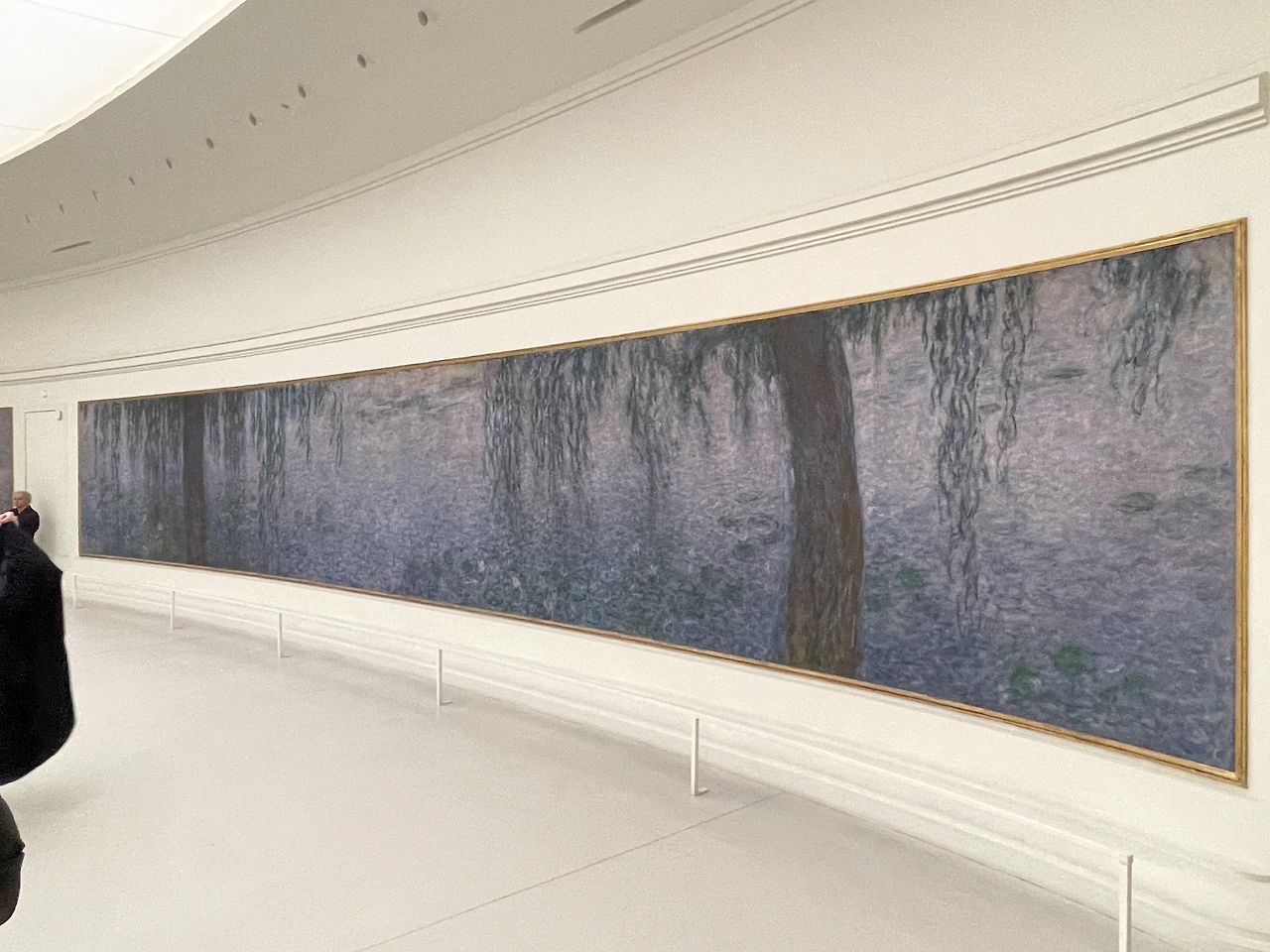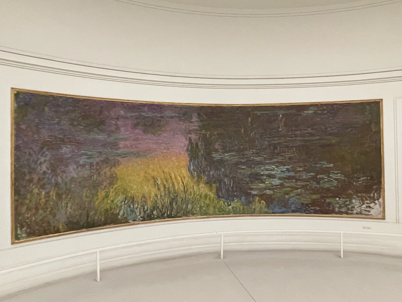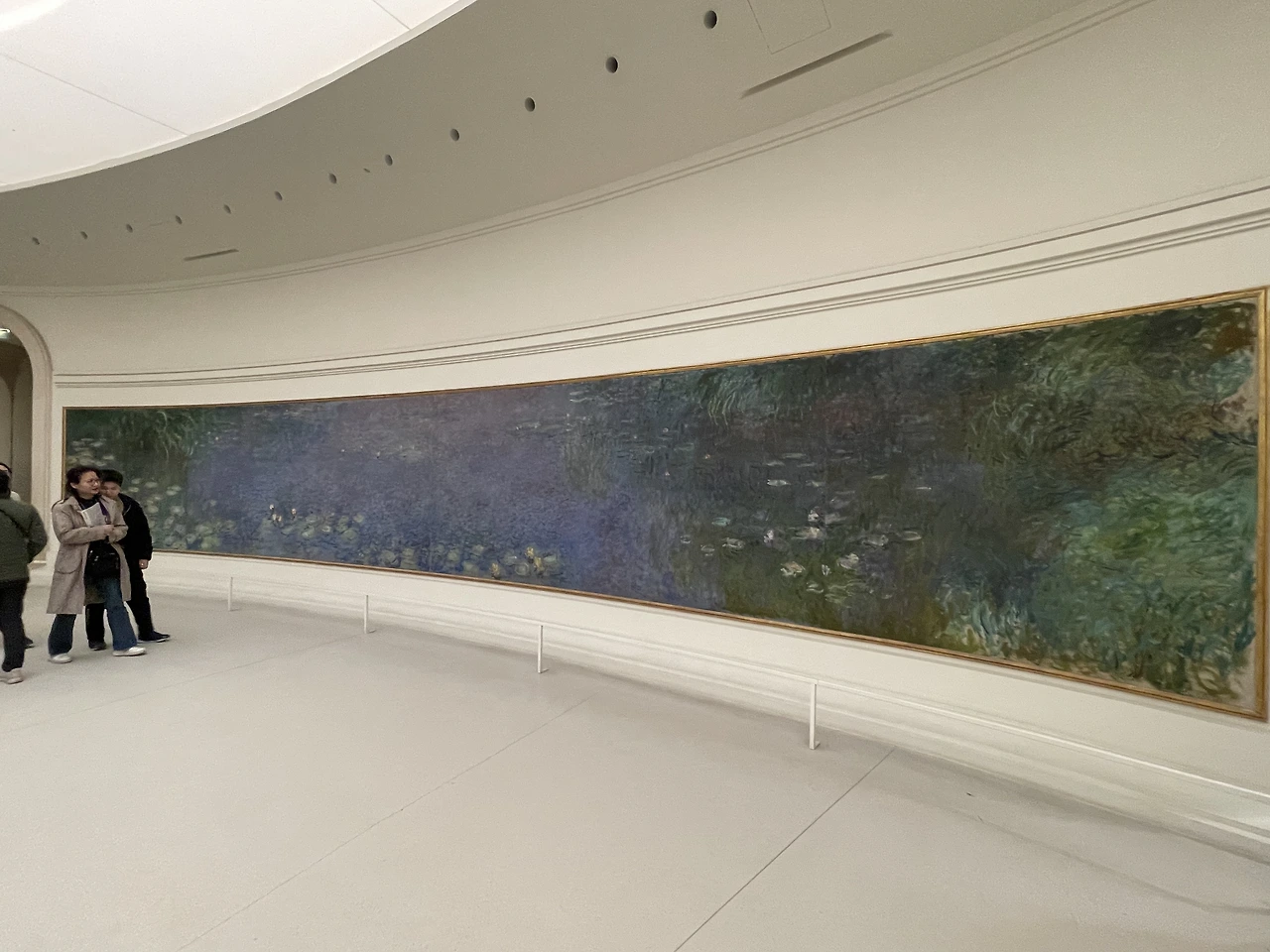 아침부터 사람들이 입장을 위해 줄을 서있다. 검색대에서 간단히 소지품 검사를 하고 입구를 지난다. 전시실에 들어서자 많은 사람들이 작품을 감상 중이었다. 모네의 수련 작품을 위해 건물의 구조를 만들었을 것으로 보이는 내부 전시실이 인상적이다. 파노라마 사진처럼 옆으로 길게 그려진 수련 그림 앞에 앉아 한참을 감상하다 보니 내가 지베르니 모네의 정원 가운데 들어와 앉아 있는 듯한 착각을 일으킨다. 제주에 살면서, 나무 숲이나 정원이나 바닷가에 앉아 멍 때리는 것을 좋아하게 되었는데, 수련 그림 앞에 앉아 있으니 제주에서처럼 익숙한 멍 때리기가 시작된다.