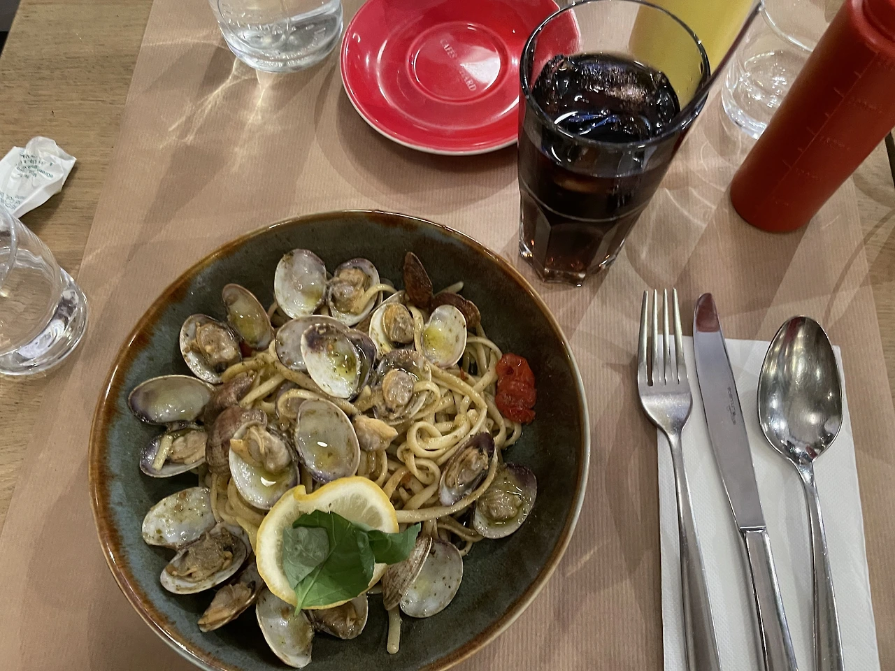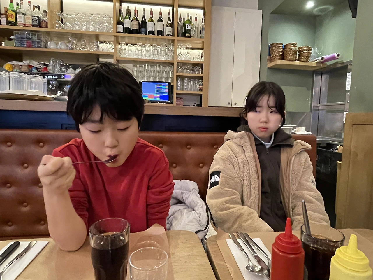 초딩 입맛 아이들이라서 아예 새로운 메뉴를 시도하지는 못하고, 이전에 한번 먹어본 음식들 위주로 주문한다. 파스타를 좋아하는 써니는 봉골레, 입이 더욱 짧은 워니는 저스트 햄버거, 나는 토마토 베이스의 양파스프를 주문했다. 음식은 특별하지도 평범하지도 않은 평타 수준. 종일 빵만 먹고 있는 아이들은 저녁은 집에서 한식을 먹자고 한다. 3끼 연속 현지식은 무리다. 특히 아이들이 먹을 수 있는 현지식이란 것이 별로 없어서, 툭하면 파스타 아니면 피자, 햄버거 일색이라 3끼 연속으로 현지식을 먹다 보면 입맛이 느끼해져서 설사 배가 많이 고픈 상태라 하더라도 잘 삼켜지지가 않는 것 같았다. 그래서 2번에 한번 정도로는 꼭 한식을 먹어줘야 군소리 없이 여행을 따라다니는 아이들이다.
