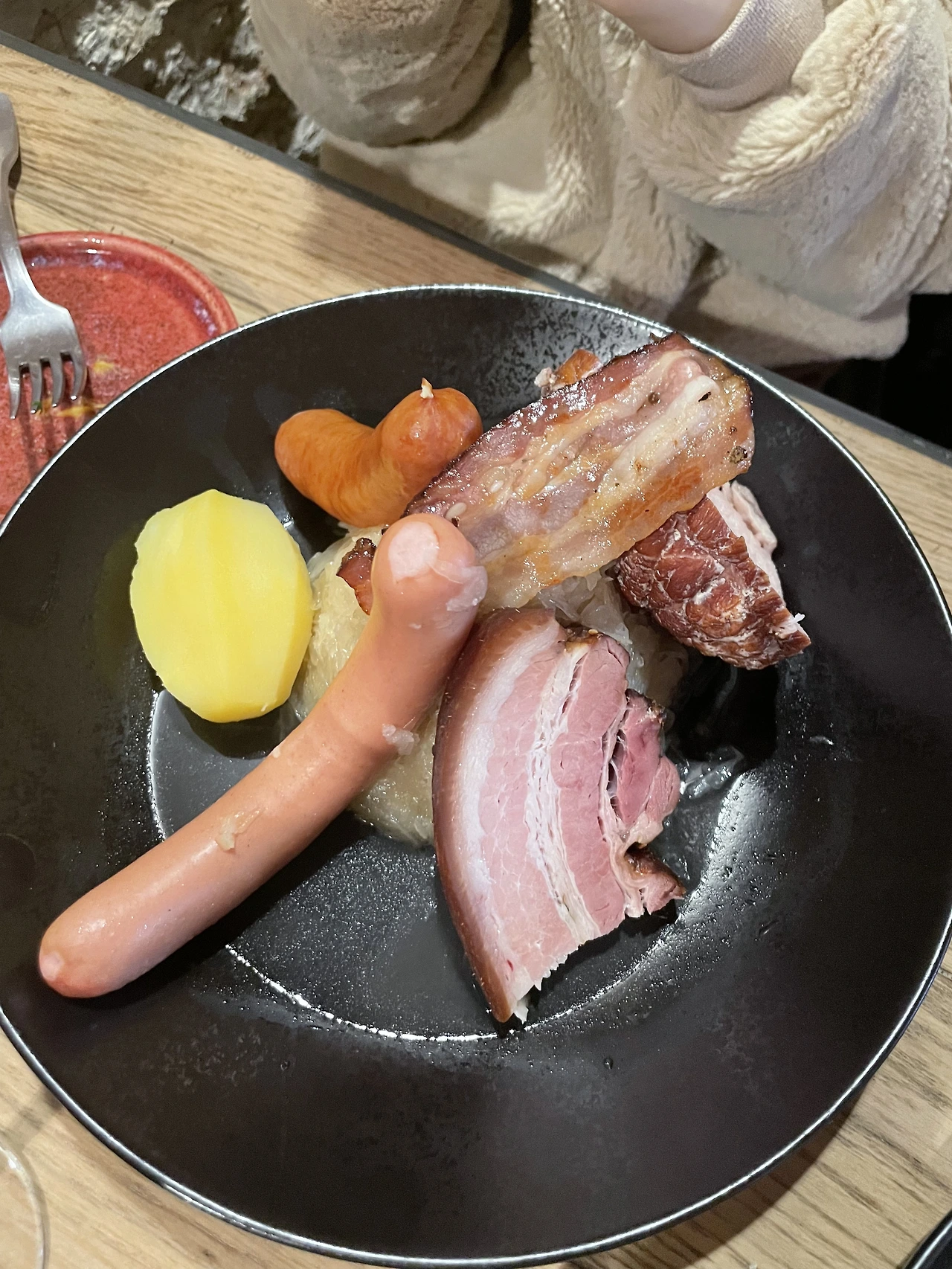 보슬비 내리는 거리를 천천히 거닐며, 문 닫은 상점의 진열대를 유리창 밖에서 구경하며 시간을 보낸다. 점심때가 되어 근처에 문을 연, 구글 평점이 높은 레스토랑을 찾아가 '슈쿠르트'로 점심을 먹었다. 슈쿠르트는 파리에서 만난 파트릭이 콜마르가 있는 알자스 지방에 가면 꼭 먹어보라고 한 지역 대표 음식이다. 양배추 절임이랑 베이컨, 소시지, 고기 등을 같이 먹는데 양배추 절임에서 묘하게 볶음김치 맛이 나서 유학생들에게 인기가 좋은 음식이라고 한다.