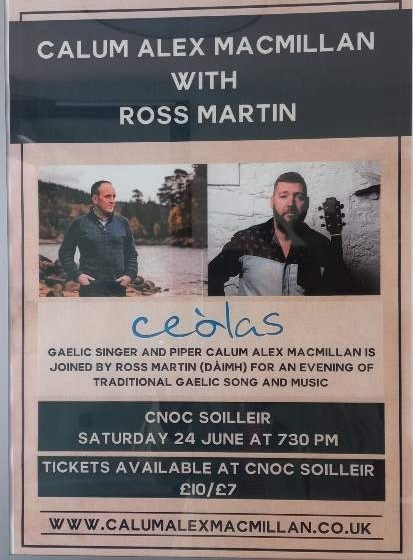 South Uist 작은 강당에서 열린 Calum Alex Macmillan와 Ross Martin 콘서트. 스코틀랜드 전통 악기와 기타를 연주하면서, 게일어 노래를 불렀다. Macmillan은 자신의 할아버지, 삼촌, 사촌 얘기를 하면서, 구슬픈 멜로디를 이어갔다. 모든 노래에는 사연과 서사가 가득했다.