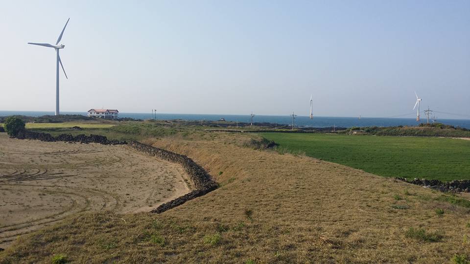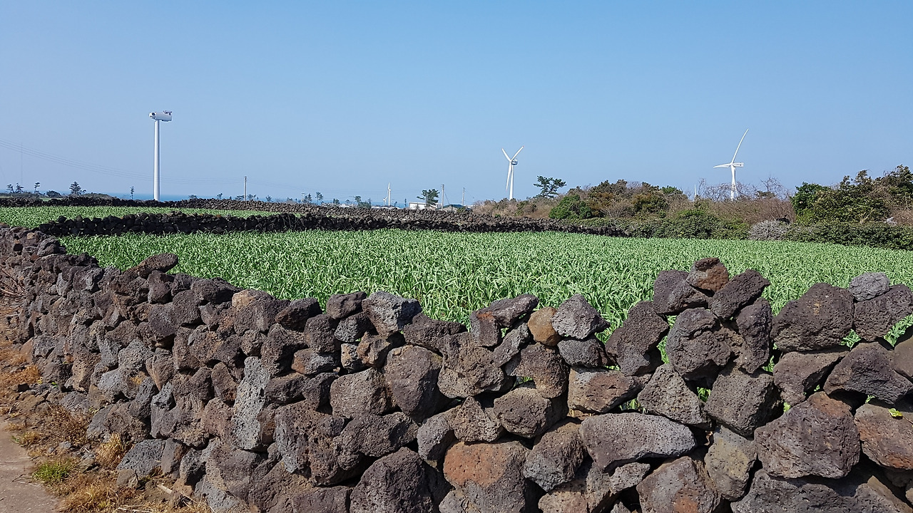 구좌체육관을 지나 호젓한 길로 들어선다. 제주 시골풍경의 전형인 초록색 작물과 검정색 현무암의 강렬한 콘트라스트, 제주 밭담길이 펼쳐진다. 밭담은 현무암으로 대충 쌓아 올린 밭의 경계를 말한다. 제주 어디든 땅을 파거나 밭을 일구다 보면 땅 속에 파묻혀 있던 현무암들이 빼꼼히 고개를 내민다. 이 많은 현무암들을 처리할 방법이 없다 보니 밭의 경계를 따라 듬성듬성 쌓게 되었고, 무덤 주변(=산담)을 둘렀고, 옆집과의 경계(=집담)를 나누곤 했다. 제주 밭담은 현재 유네스코 세계자연유산의 등재를 기다리고 있다.