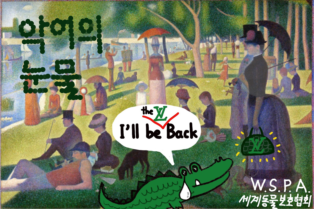 명품백이 될 자신의 운명을 직감하며 'I'll be (the) bag=back'을 외치며 눈물을 흘리는 악어가 Key Idea예요. 비주얼은 신인상주의 미술가인 조르주 쇠라의 대표작 '그랑드 자트 섬의 일요일 오후'를 모티프로 그림 안의 귀족여인에게 가방을 들렸고 잔디밭 위에 악어가 노니는 설정으로 처리해 봤습니다. 점묘법으로 처리한 헤드카피의 의도까지 읽으셨다면 당신은 센스쟁이, 훗훗훗^^